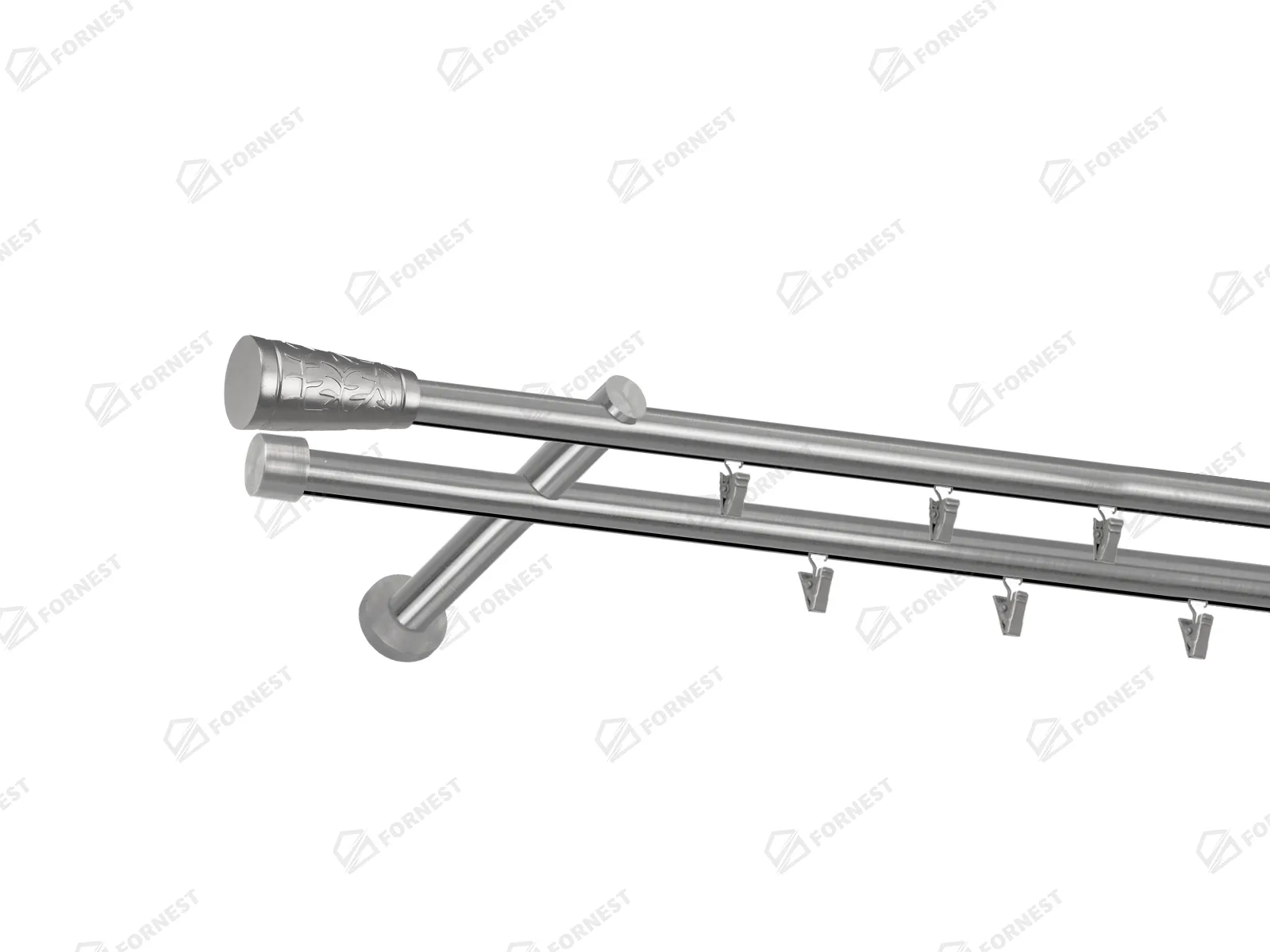 Dvojradová garniža s povrchovou úpravou - odtieň satin-nikel (matné striebro). Celokovové garniže s kvalitnou povrchovou úpravou - galvanické pokovovanie. Galvanické pokovovanie zabezpečuje vyššiu povrchovú tvrdosť, zvýšenú dolnosť voči poškriabaniu, hladký povrch. Dodávané sú v kompletoch.