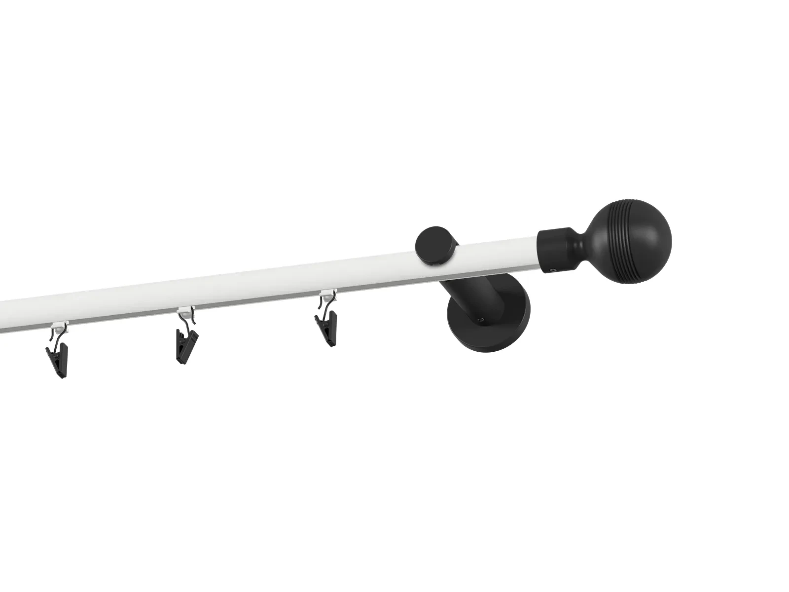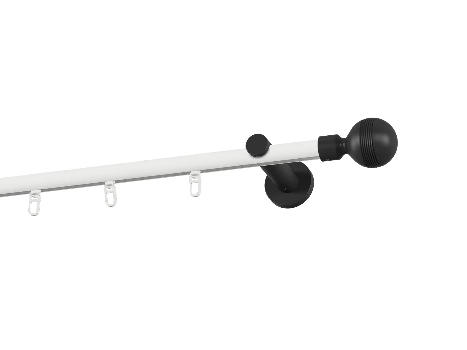Jednořadá drážková garnýž s povrchovou úpravou - bílo černá lakovaná. Garnyže jsou dodávány jsou v kompletech. Tvar koncovky a typ držáku dle zadaného výběru.