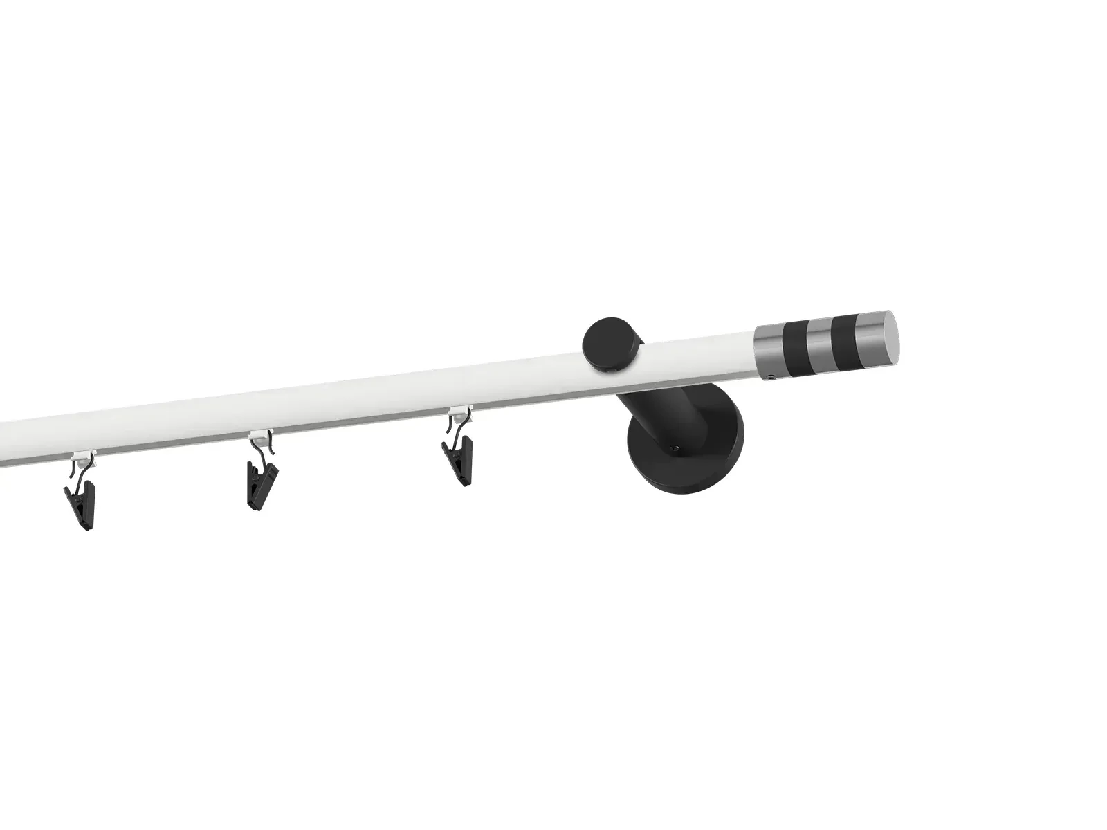 Jednořadá drážková garnýž s povrchovou úpravou - bílo černá lakovaná. Garnyže jsou dodávány jsou v kompletech. Tvar koncovky a typ držáku dle zadaného výběru.