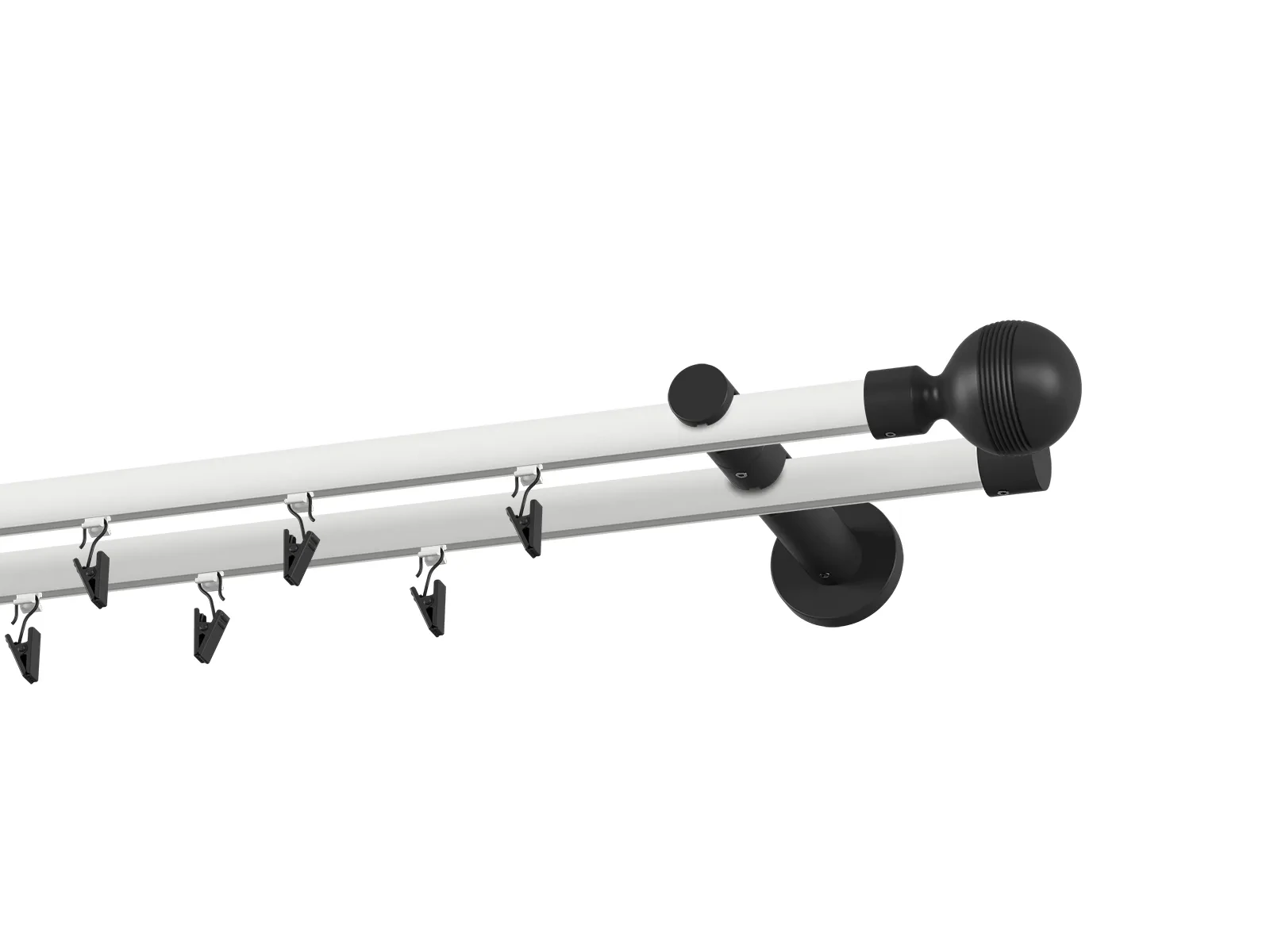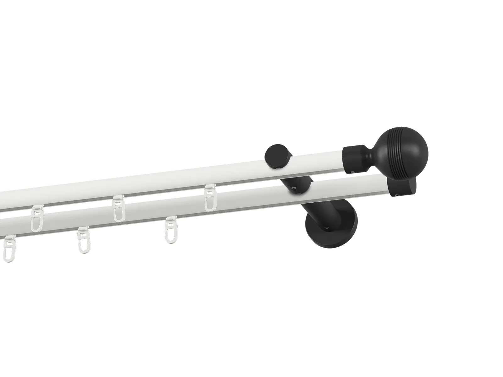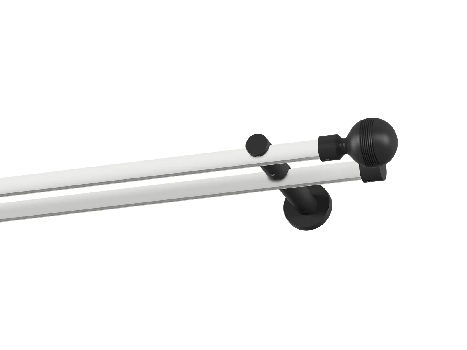 Dvouřadá drážková garnýž s povrchovou úpravou - bílo černá lakovaná. Garnyže jsou dodávány jsou v kompletech. Tvar koncovky a typ držáku dle zadaného výběru.