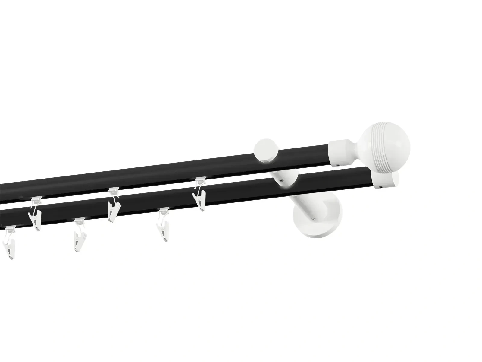 Dvouřadá drážková garnýž s povrchovou úpravou - černo bílá lakovaná. Garnyže jsou dodávány jsou v kompletech. Tvar koncovky a typ držáku dle zadaného výběru.