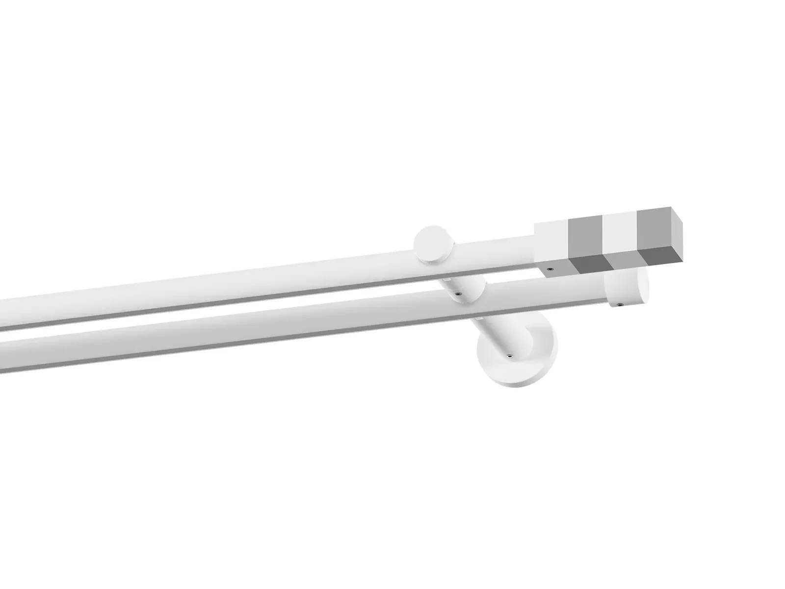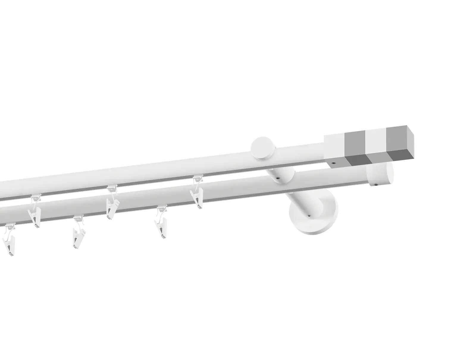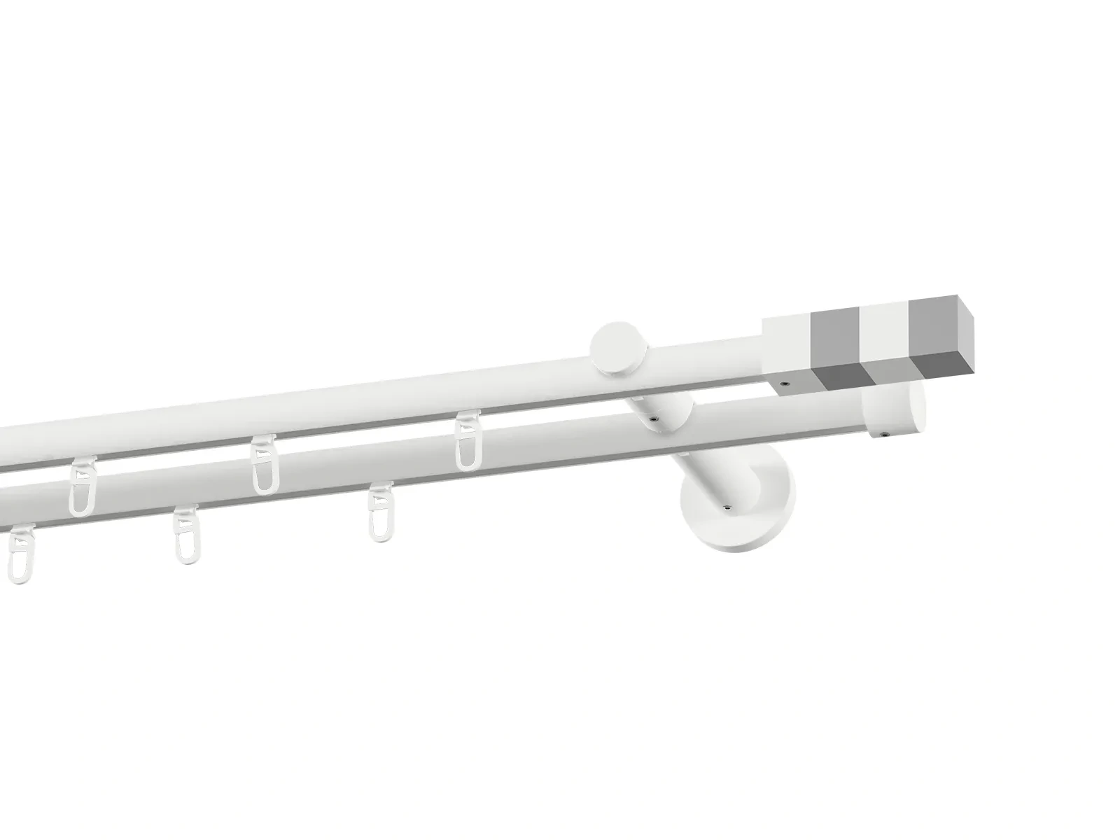 Dvouřadá drážková garnýž s povrchovou úpravou - bílá lakovaná. Garnyže jsou dodávány jsou v kompletech. Tvar koncovky a typ držáku dle zadaného výběru.
