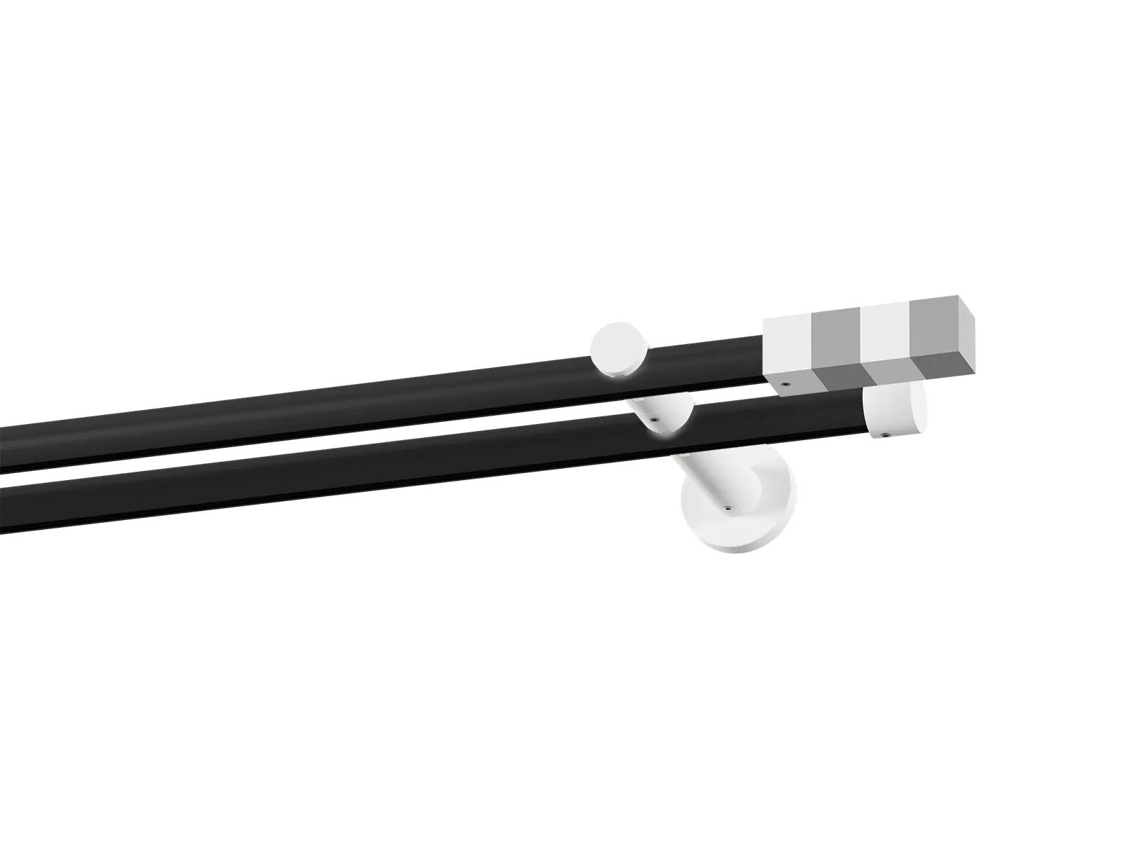 Dvouřadá drážková garnýž s povrchovou úpravou - černo bílá lakovaná. Garnyže jsou dodávány jsou v kompletech. Tvar koncovky a typ držáku dle zadaného výběru.