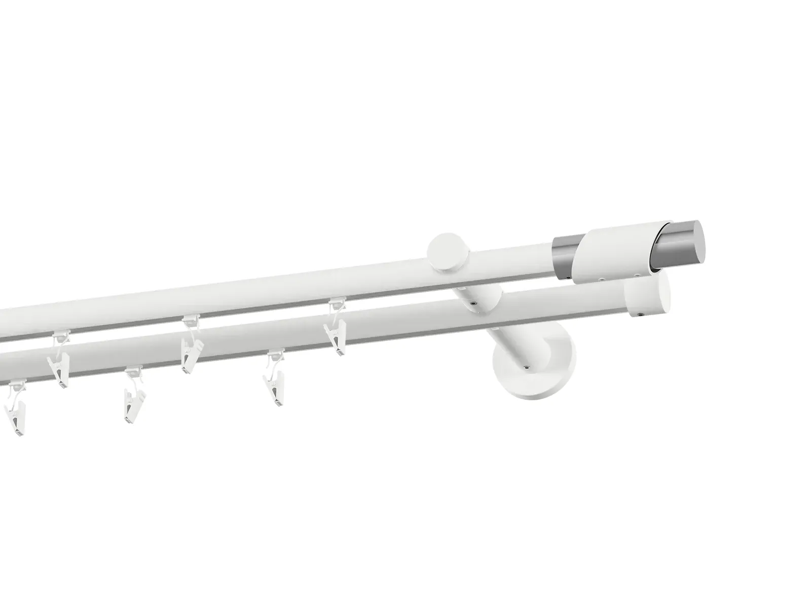 Dvouřadá drážková garnýž s povrchovou úpravou - bílá lakovaná. Garnyže jsou dodávány jsou v kompletech. Tvar koncovky a typ držáku dle zadaného výběru.