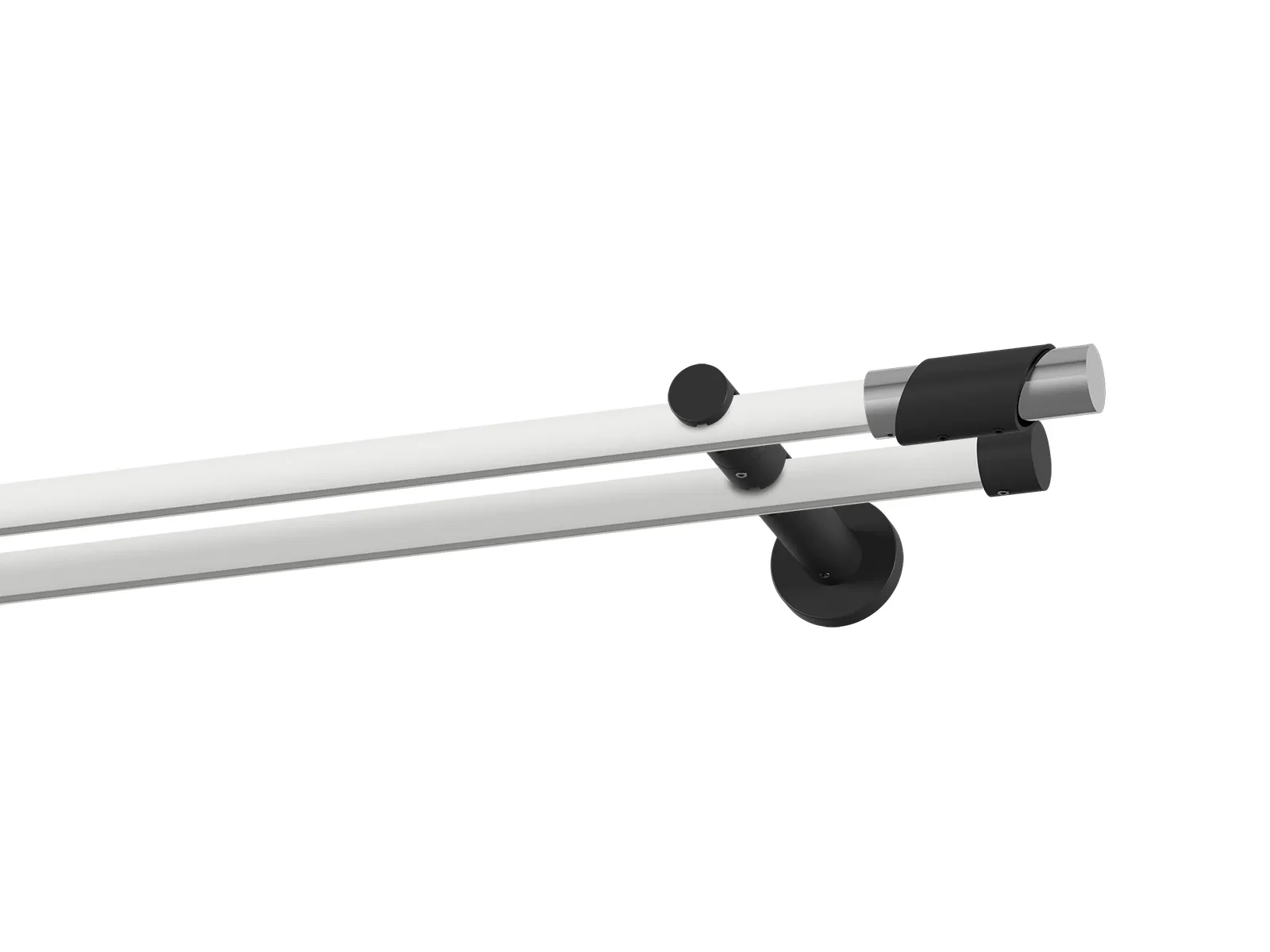 Dvouřadá drážková garnýž s povrchovou úpravou - bílo černá lakovaná. Garnyže jsou dodávány jsou v kompletech. Tvar koncovky a typ držáku dle zadaného výběru.