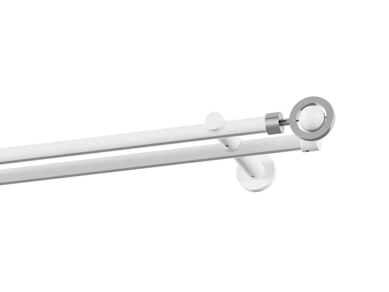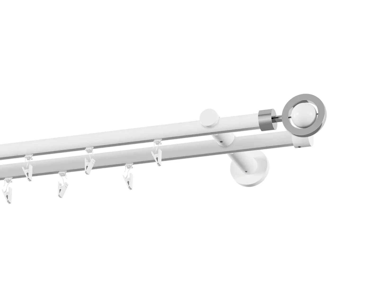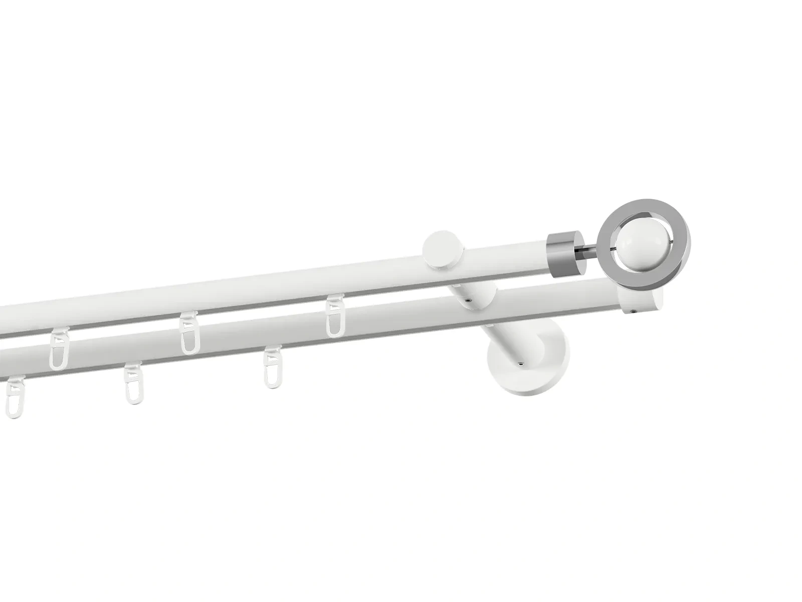 Dvouřadá drážková garnýž s povrchovou úpravou - bílá lakovaná. Garnyže jsou dodávány jsou v kompletech. Tvar koncovky a typ držáku dle zadaného výběru.
