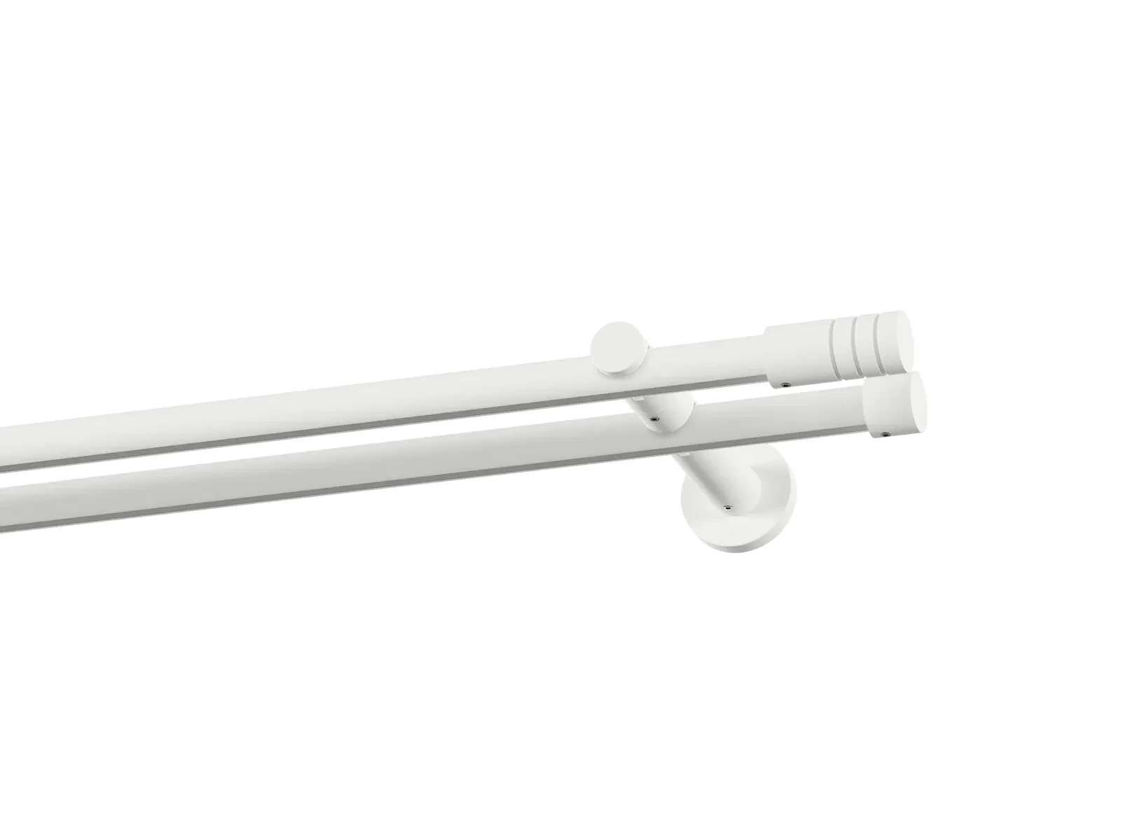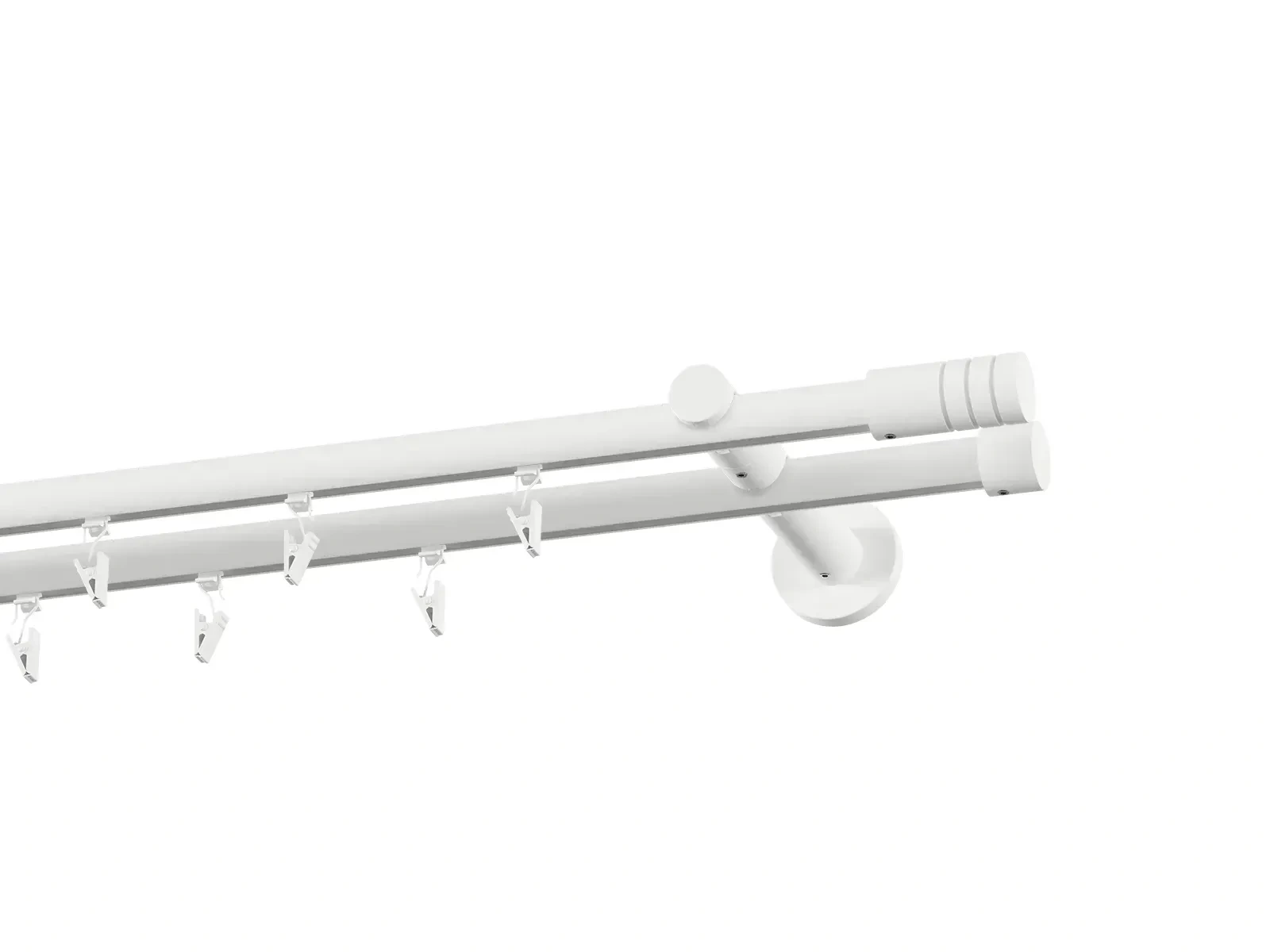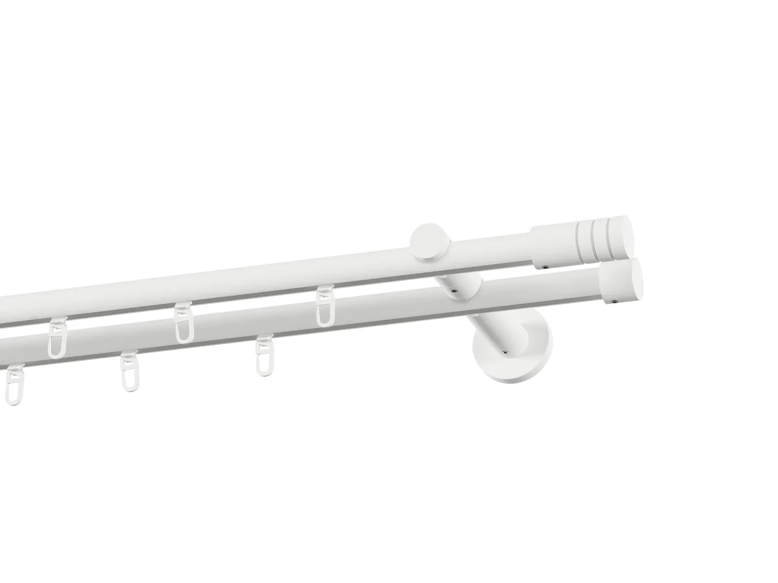 Dvouřadá drážková garnýž s povrchovou úpravou - bílá lakovaná. Garnyže jsou dodávány jsou v kompletech. Tvar koncovky a typ držáku dle zadaného výběru.