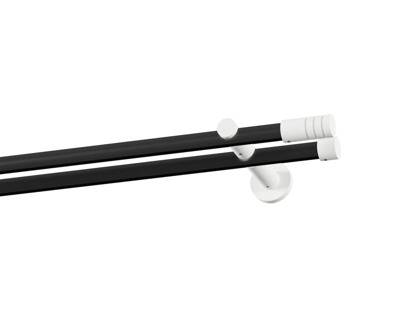 Dvouřadá drážková garnýž s povrchovou úpravou - černo bílá lakovaná. Garnyže jsou dodávány jsou v kompletech. Tvar koncovky a typ držáku dle zadaného výběru.