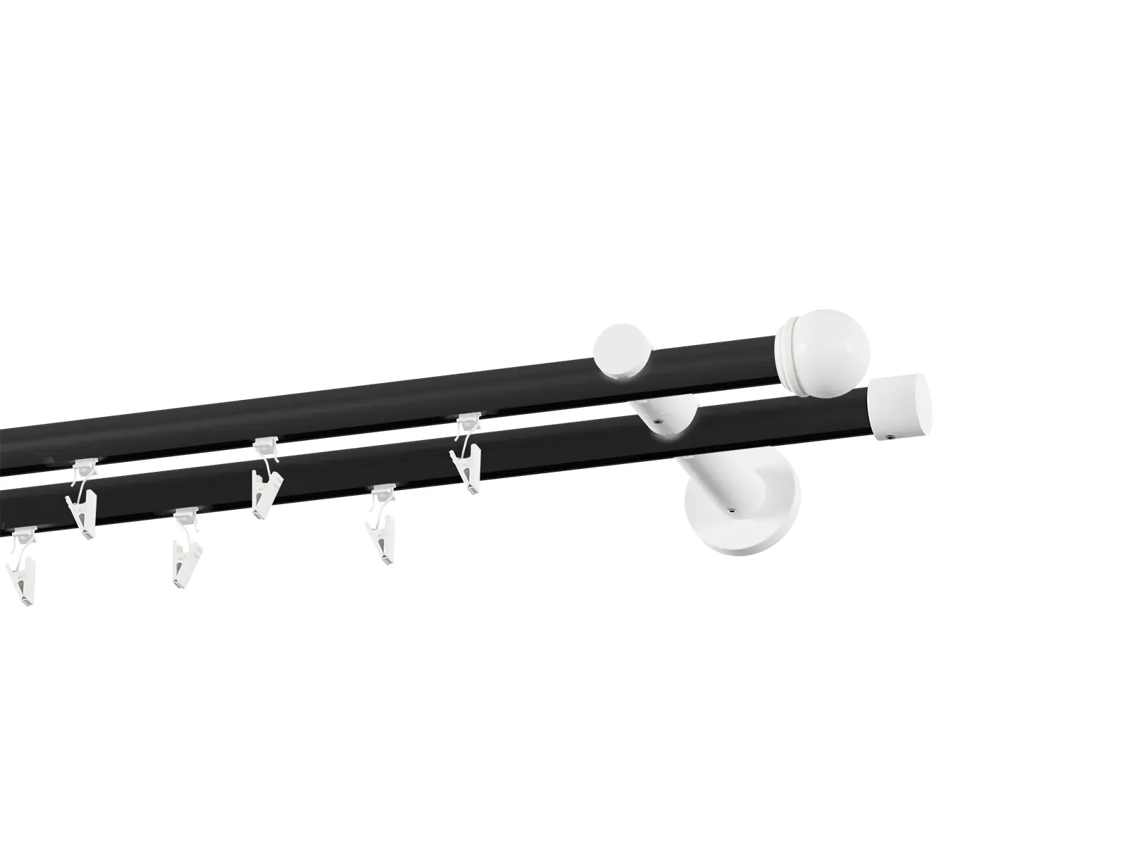 Dvouřadá drážková garnýž s povrchovou úpravou - černo bílá lakovaná. Garnyže jsou dodávány jsou v kompletech. Tvar koncovky a typ držáku dle zadaného výběru.