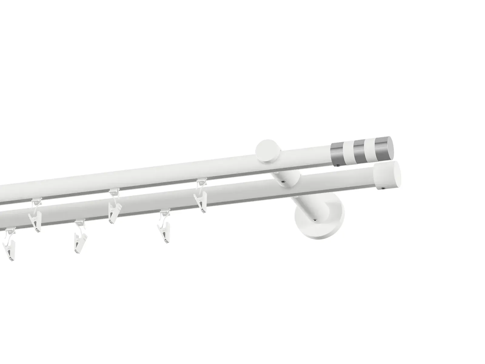 Dvouřadá drážková garnýž s povrchovou úpravou - bílá lakovaná. Garnyže jsou dodávány jsou v kompletech. Tvar koncovky a typ držáku dle zadaného výběru.