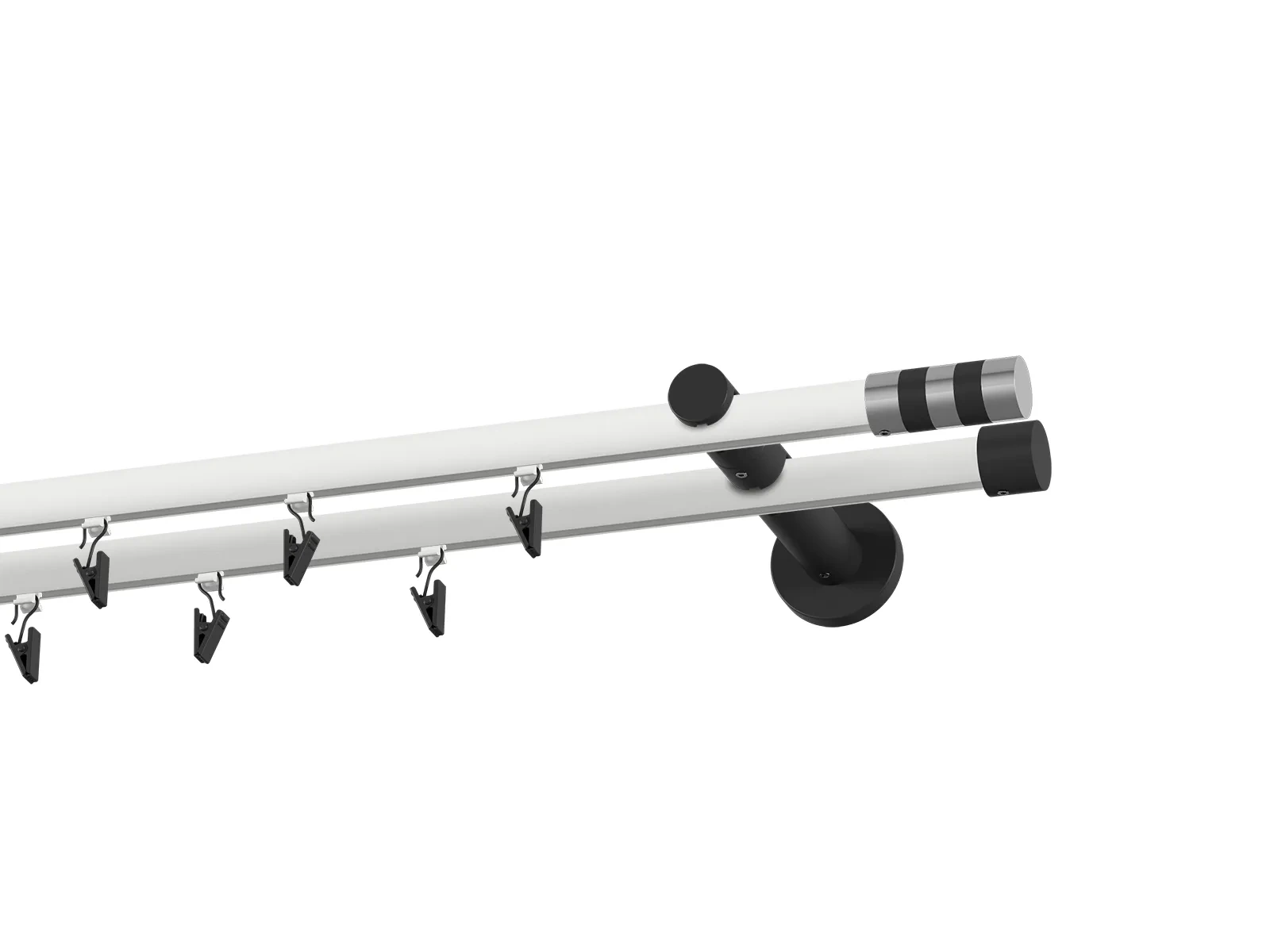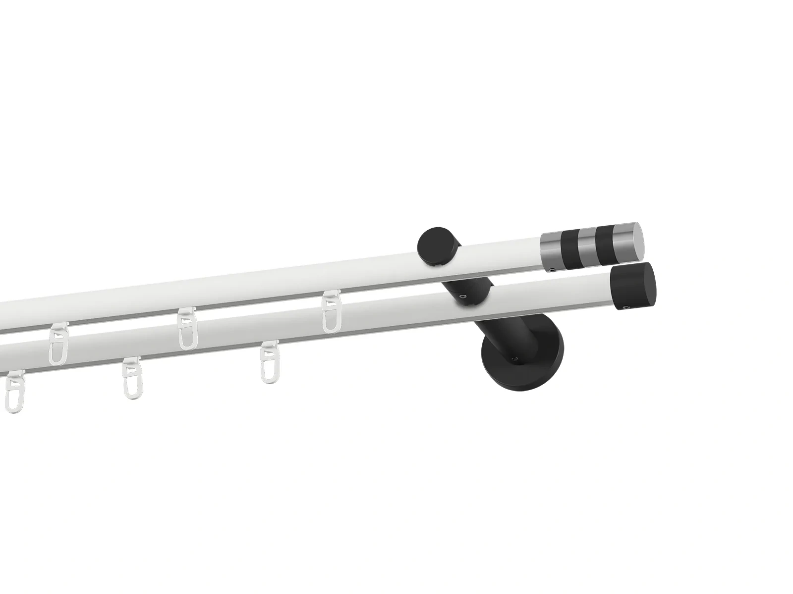 Dvouřadá drážková garnýž s povrchovou úpravou - bílo černá lakovaná. Garnyže jsou dodávány jsou v kompletech. Tvar koncovky a typ držáku dle zadaného výběru.