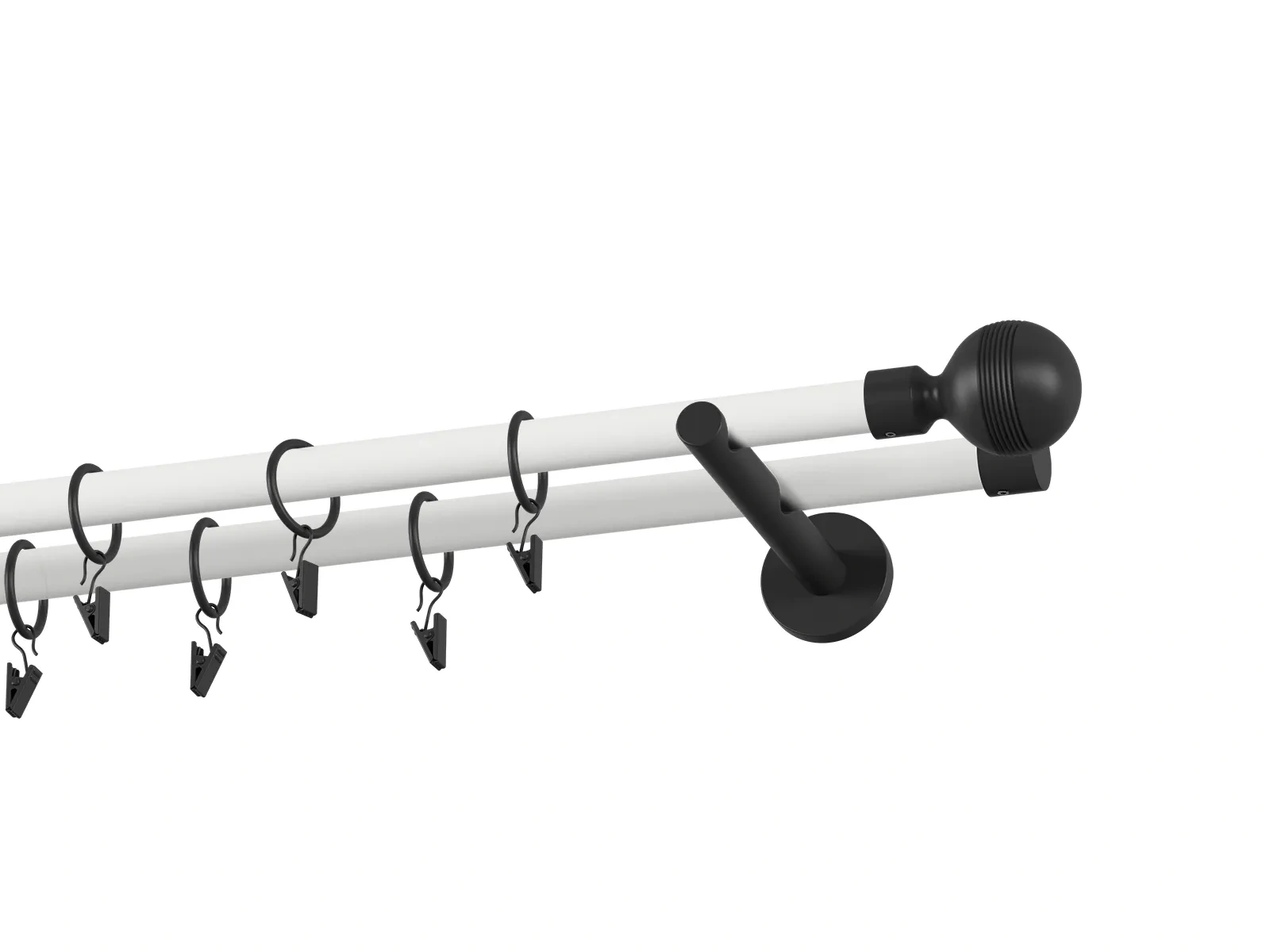 Dvouřadá garnýž s povrchovou úpravou - bílo černá lakovaná. Garnyže jsou dodávány jsou v kompletech. Tvar koncovky a typ držáku dle zadaného výběru.