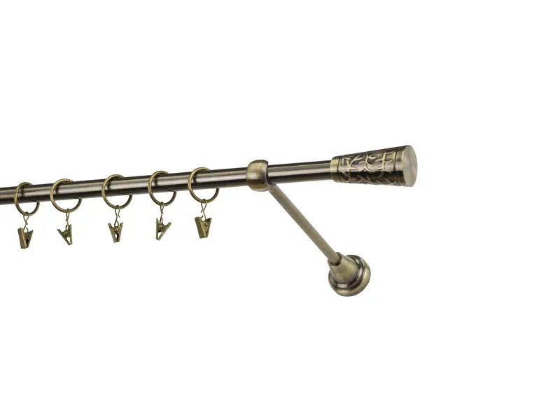 Jednořadá garnýž s povrchovou úpravou - odstín antik (matné zlato). Celokovová garnýž s kvalitní povrchovou úpravou - galvanické pokovování. Galvanické pokovování zabezpečuje vyšší povrchovou tvrdost, zvýšenú dolnost vůči poškrábání, hladký povrch. Dodávané jsou v kompletech.