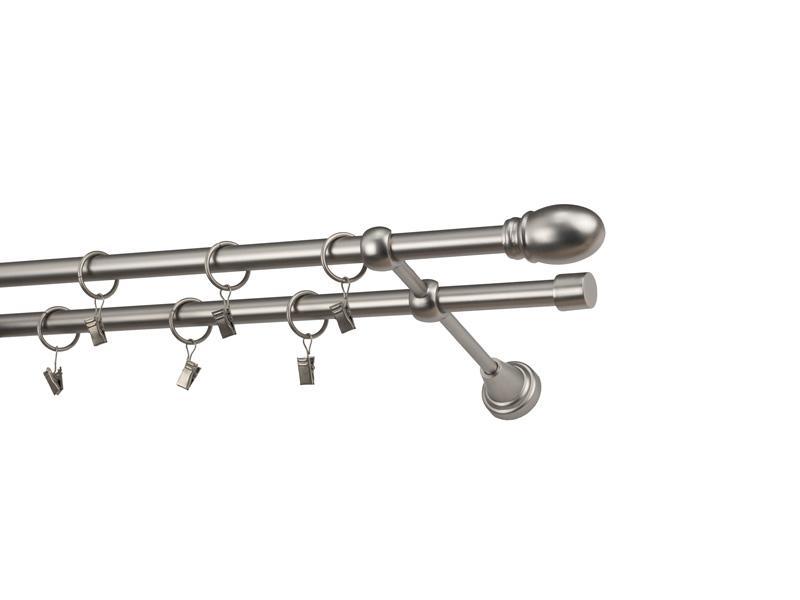 Dvouřadá garnýž s povrchovou úpravou - odstín satin (matné stříbro). Celokovová garnýž s kvalitní povrchovou úpravou - galvanické pokovování. Galvanické pokovování zabezpečuje vyšší povrchovou tvrdost, zvýšenú dolnost vůči poškrábání, hladký povrch. Dodávané jsou v kompletech.