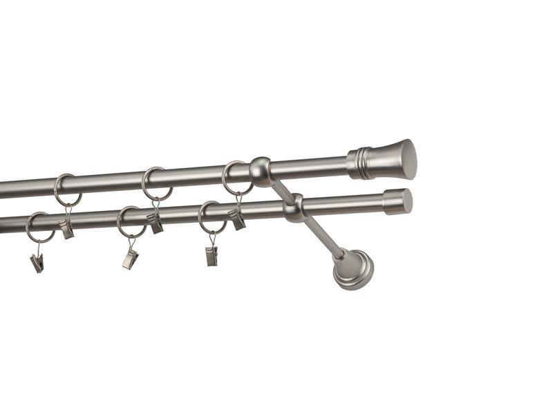 Dvouřadá garnýž s povrchovou úpravou - odstín satin (matné stříbro). Celokovová garnýž s kvalitní povrchovou úpravou - galvanické pokovování. Galvanické pokovování zabezpečuje vyšší povrchovou tvrdost, zvýšenú dolnost vůči poškrábání, hladký povrch. Dodávané jsou v kompletech.