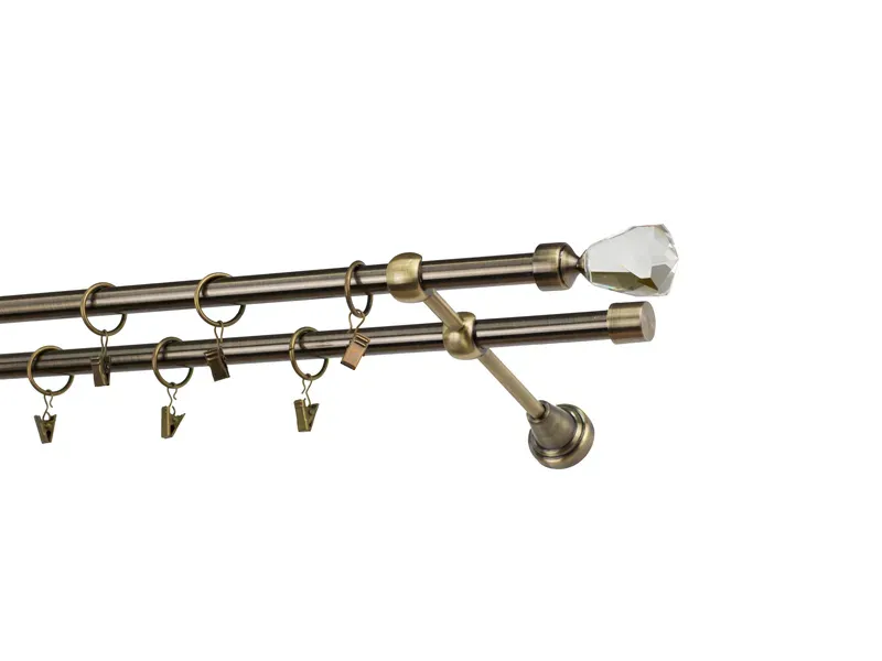 Dvouřadá garnýž s povrchovou úpravou - odstín antik (matné zlato). Celokovová garnýž s kvalitní povrchovou úpravou - galvanické pokovování. Galvanické pokovování zabezpečuje vyšší povrchovou tvrdost, zvýšenú dolnost vůči poškrábání, hladký povrch. Dodávané jsou v kompletech.