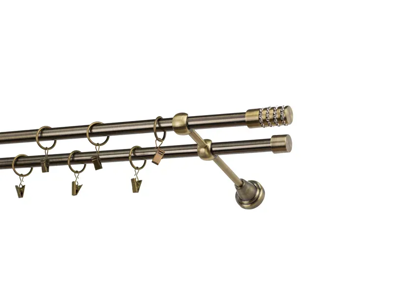 Dvouřadá garnýž s povrchovou úpravou - odstín antik (matné zlato). Celokovová garnýž s kvalitní povrchovou úpravou - galvanické pokovování. Galvanické pokovování zabezpečuje vyšší povrchovou tvrdost, zvýšenú dolnost vůči poškrábání, hladký povrch. Dodávané jsou v kompletech.