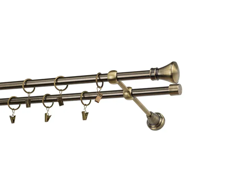 Dvouřadá garnýž s povrchovou úpravou - odstín antik (matné zlato). Celokovová garnýž s kvalitní povrchovou úpravou - galvanické pokovování. Galvanické pokovování zabezpečuje vyšší povrchovou tvrdost, zvýšenú dolnost vůči poškrábání, hladký povrch. Dodávané jsou v kompletech.