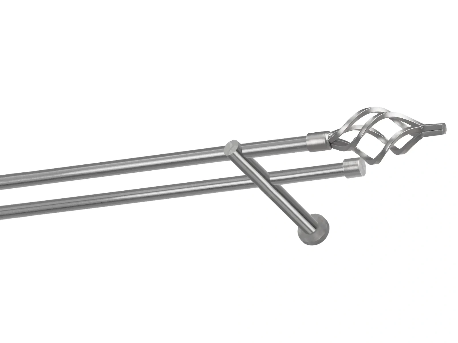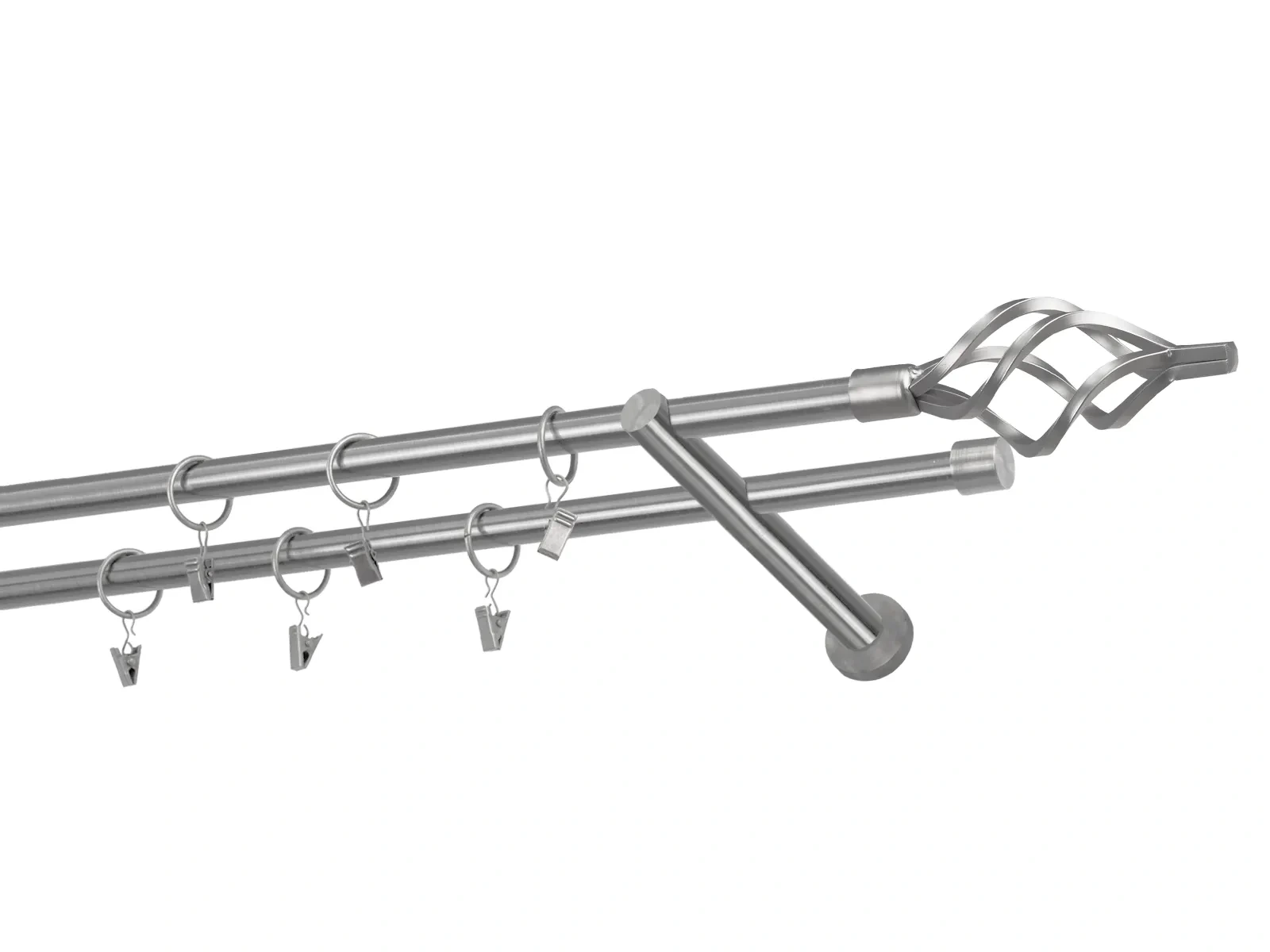 Dvouřadá garnýž s povrchovou úpravou - odstín satin (matné stříbro). Celokovová garnýž s kvalitní povrchovou úpravou - galvanické pokovování. Galvanické pokovování zabezpečuje vyšší povrchovou tvrdost, zvýšenú dolnost vůči poškrábání, hladký povrch. Dodávané jsou v kompletech.