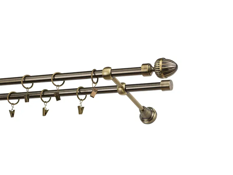 Dvouřadá garnýž s povrchovou úpravou - odstín antik (matné zlato). Celokovová garnýž s kvalitní povrchovou úpravou - galvanické pokovování. Galvanické pokovování zabezpečuje vyšší povrchovou tvrdost, zvýšenú dolnost vůči poškrábání, hladký povrch. Dodávané jsou v kompletech.