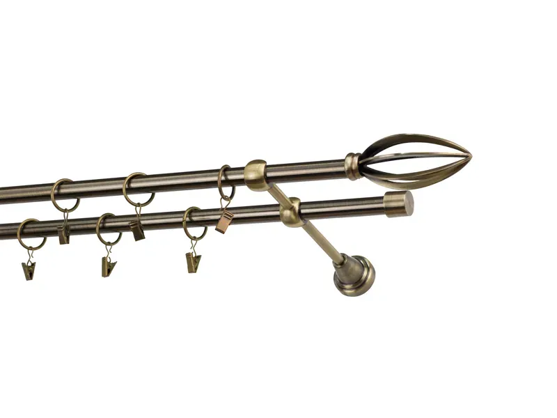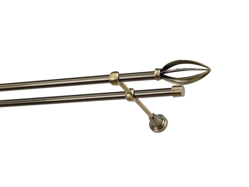 Dvouřadá garnýž s povrchovou úpravou - odstín antik (matné zlato). Celokovová garnýž s kvalitní povrchovou úpravou - galvanické pokovování. Galvanické pokovování zabezpečuje vyšší povrchovou tvrdost, zvýšenú dolnost vůči poškrábání, hladký povrch. Dodávané jsou v kompletech.