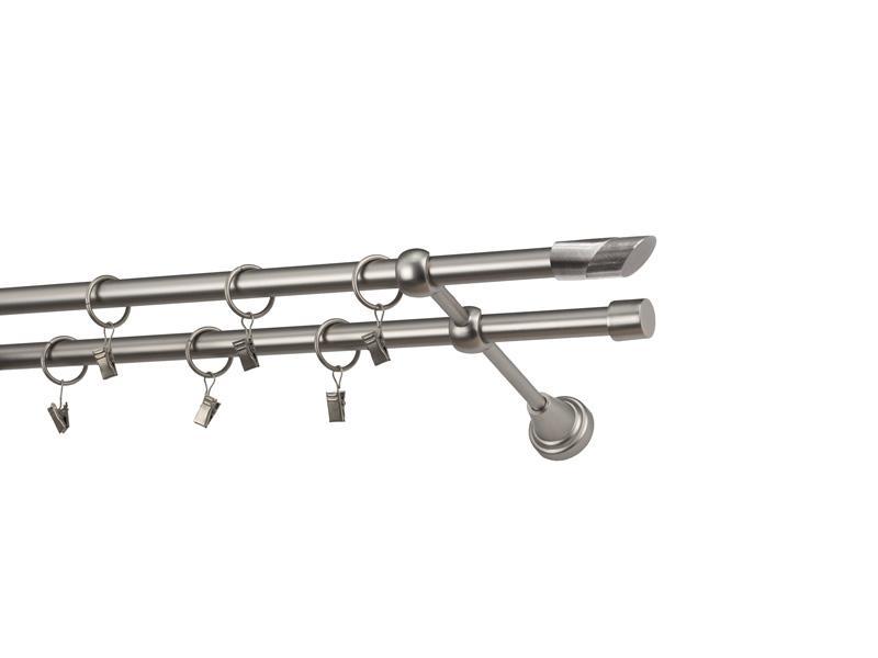 Dvouřadá garnýž s povrchovou úpravou - odstín satin (matné stříbro). Celokovová garnýž s kvalitní povrchovou úpravou - galvanické pokovování. Galvanické pokovování zabezpečuje vyšší povrchovou tvrdost, zvýšenú dolnost vůči poškrábání, hladký povrch. Dodávané jsou v kompletech.