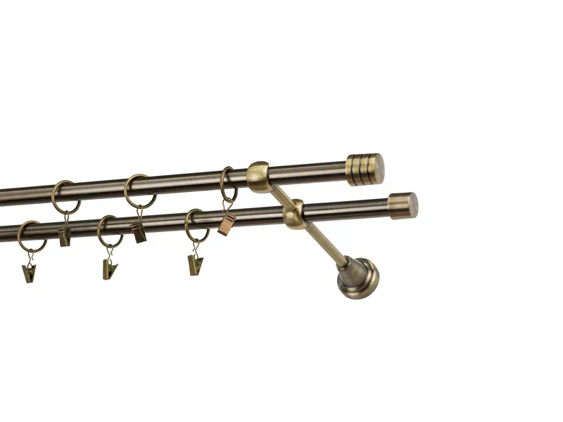 Dvouřadá garnýž s povrchovou úpravou - odstín antik (matné zlato). Celokovová garnýž s kvalitní povrchovou úpravou - galvanické pokovování. Galvanické pokovování zabezpečuje vyšší povrchovou tvrdost, zvýšenú dolnost vůči poškrábání, hladký povrch. Dodávané jsou v kompletech.