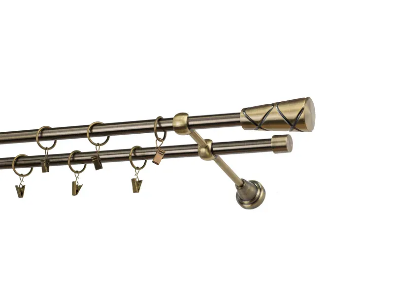 Dvouřadá garnýž s povrchovou úpravou - odstín antik (matné zlato). Celokovová garnýž s kvalitní povrchovou úpravou - galvanické pokovování. Galvanické pokovování zabezpečuje vyšší povrchovou tvrdost, zvýšenú dolnost vůči poškrábání, hladký povrch. Dodávané jsou v kompletech.
