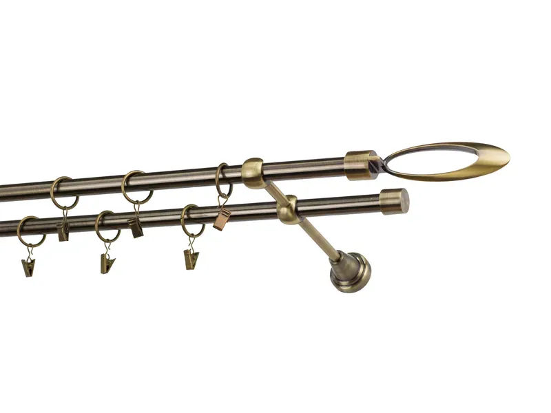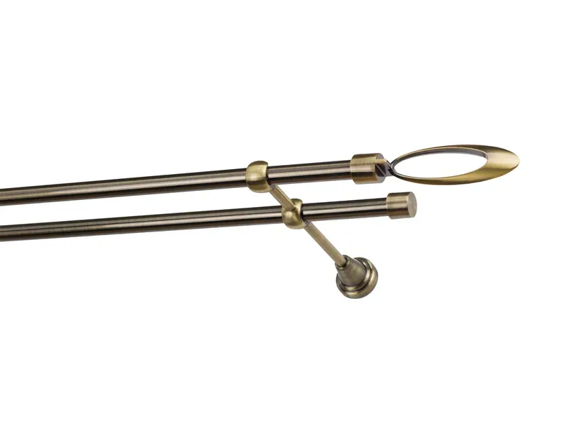 Dvouřadá garnýž s povrchovou úpravou - odstín antik (matné zlato). Celokovová garnýž s kvalitní povrchovou úpravou - galvanické pokovování. Galvanické pokovování zabezpečuje vyšší povrchovou tvrdost, zvýšenú dolnost vůči poškrábání, hladký povrch. Dodávané jsou v kompletech.