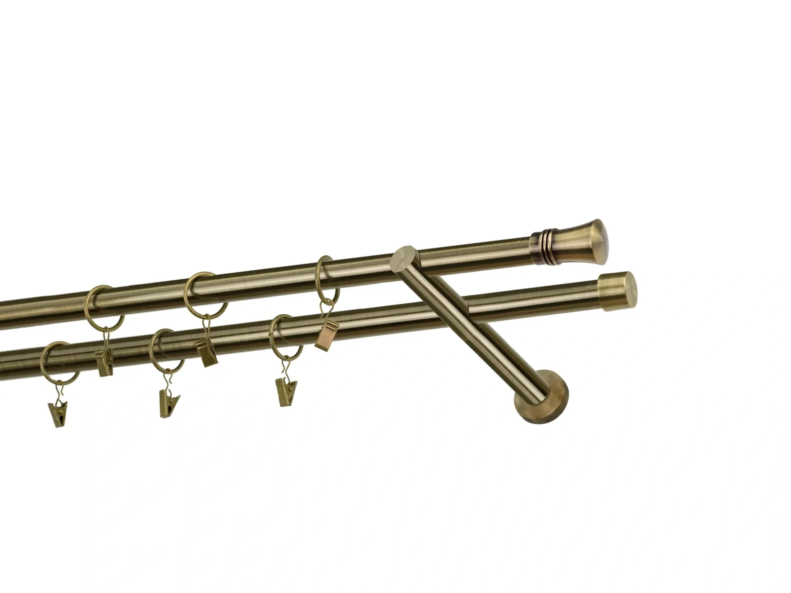 Dvouřadá garnýž s povrchovou úpravou - odstín antik (matné zlato). Celokovová garnýž s kvalitní povrchovou úpravou - galvanické pokovování. Galvanické pokovování zabezpečuje vyšší povrchovou tvrdost, zvýšenú dolnost vůči poškrábání, hladký povrch. Dodávané jsou v kompletech.