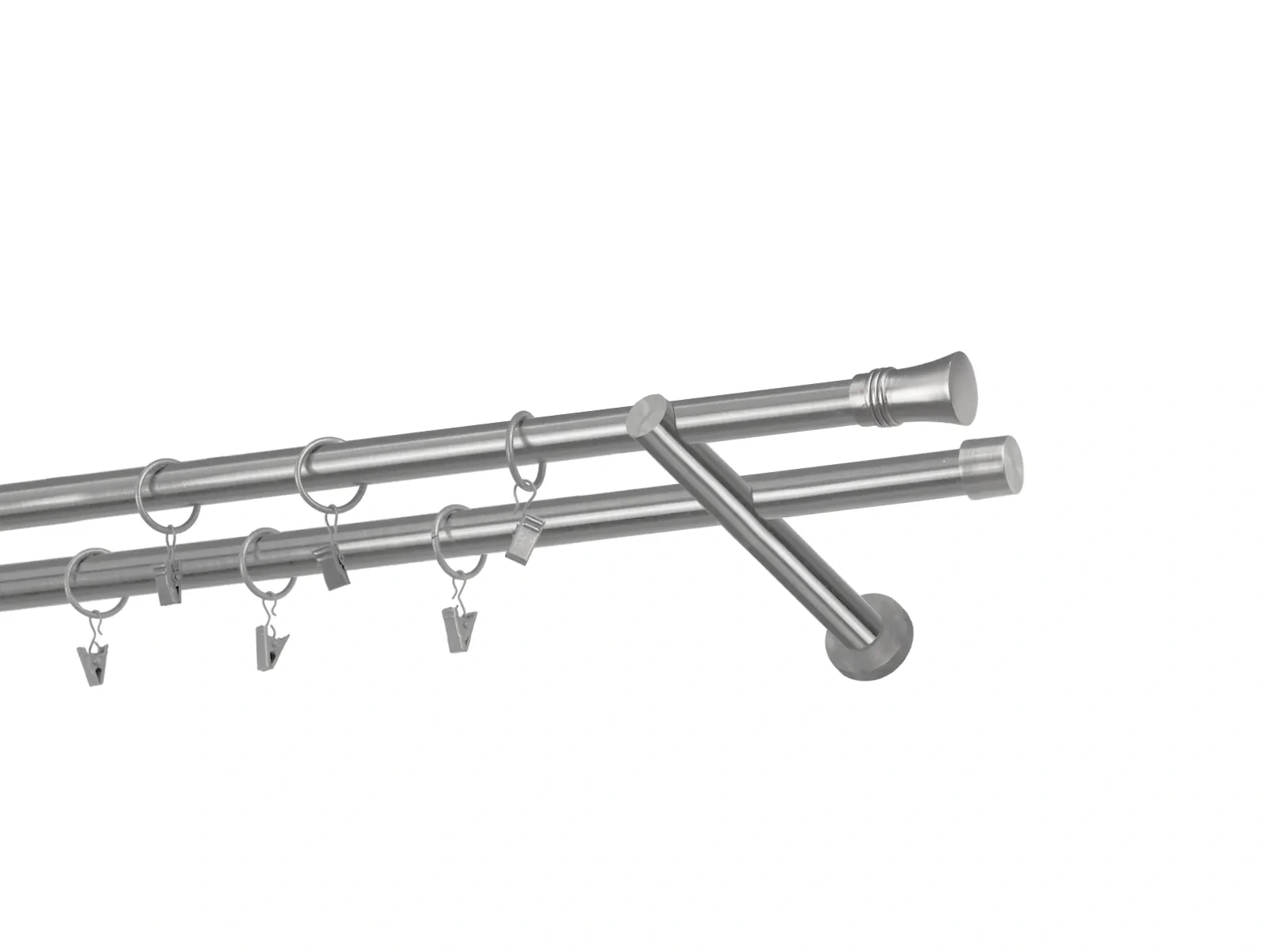 Dvouřadá garnýž s povrchovou úpravou - odstín satin (matné stříbro). Celokovová garnýž s kvalitní povrchovou úpravou - galvanické pokovování. Galvanické pokovování zabezpečuje vyšší povrchovou tvrdost, zvýšenú dolnost vůči poškrábání, hladký povrch. Dodávané jsou v kompletech.