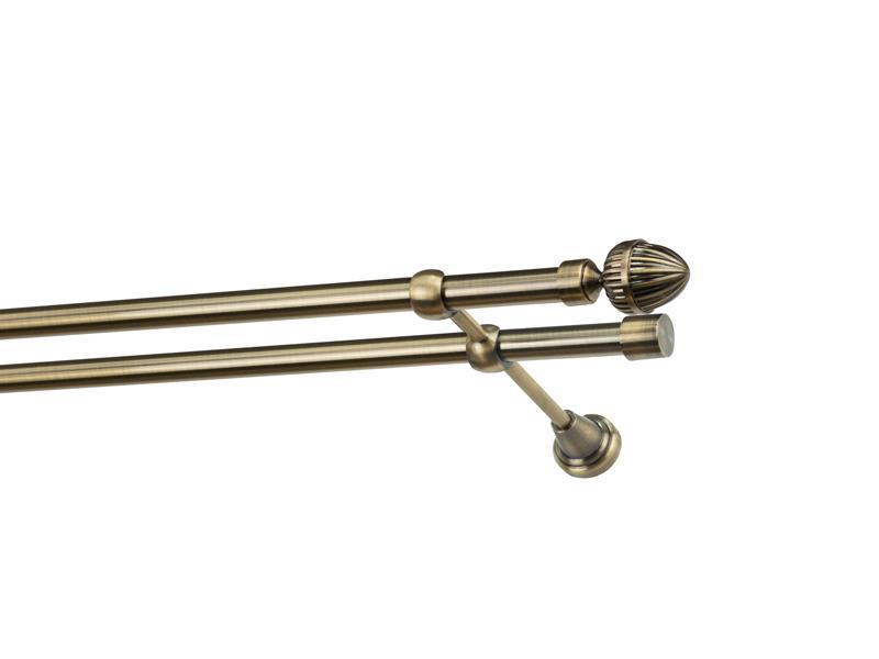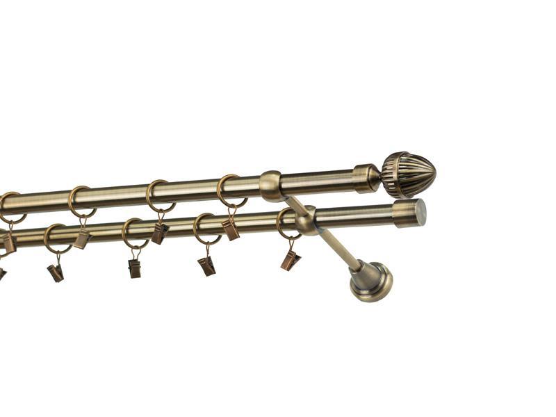 Dvouřadá garnýž s povrchovou úpravou - odstín antik (matné zlato). Celokovová garnýž s kvalitní povrchovou úpravou - galvanické pokovování. Galvanické pokovování zabezpečuje vyšší povrchovou tvrdost, zvýšenú dolnost vůči poškrábání, hladký povrch. Dodávané jsou v kompletech.