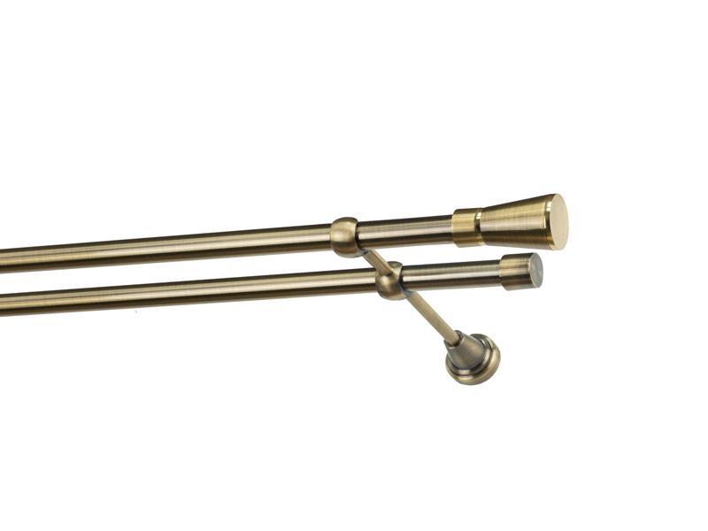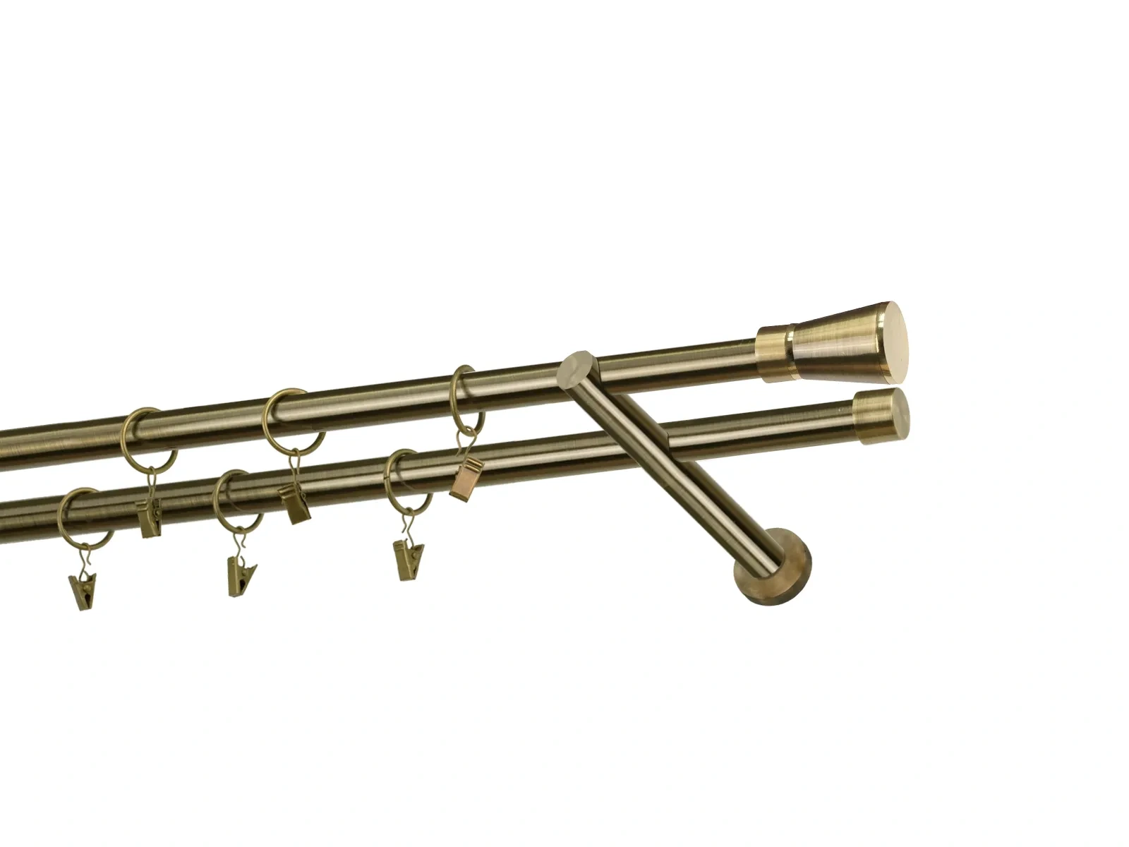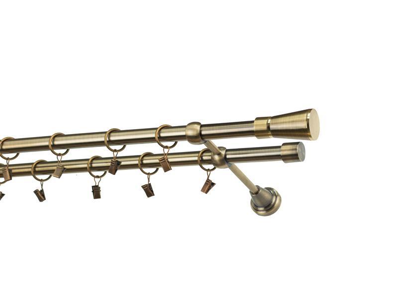 Dvouřadá garnýž s povrchovou úpravou - odstín antik (matné zlato). Celokovová garnýž s kvalitní povrchovou úpravou - galvanické pokovování. Galvanické pokovování zabezpečuje vyšší povrchovou tvrdost, zvýšenú dolnost vůči poškrábání, hladký povrch. Dodávané jsou v kompletech.