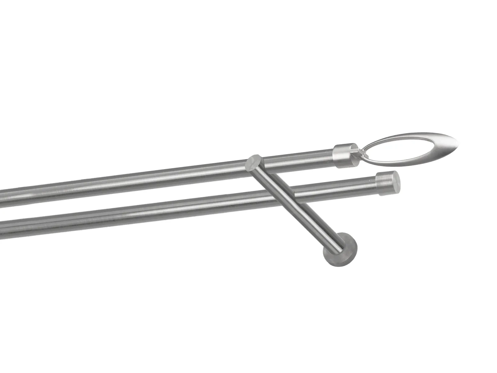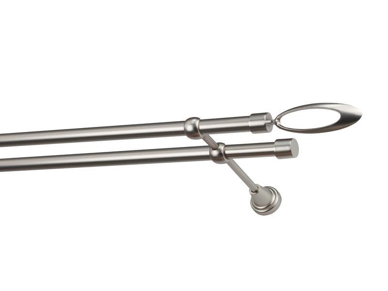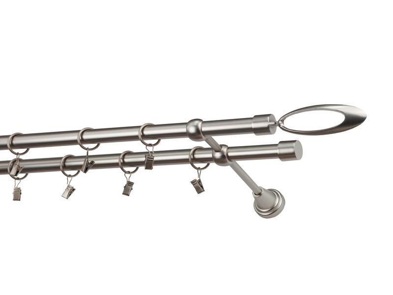 Dvouřadá garnýž s povrchovou úpravou - odstín satin (matné stříbro). Celokovová garnýž s kvalitní povrchovou úpravou - galvanické pokovování. Galvanické pokovování zabezpečuje vyšší povrchovou tvrdost, zvýšenú dolnost vůči poškrábání, hladký povrch. Dodávané jsou v kompletech.