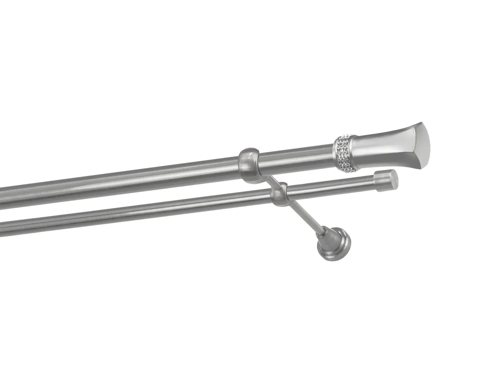 Dvouřadá garnýž s povrchovou úpravou - odstín satin (matné stříbro). Celokovová garnýž s kvalitní povrchovou úpravou - galvanické pokovování. Galvanické pokovování zabezpečuje vyšší povrchovou tvrdost, zvýšenú dolnost vůči poškrábání, hladký povrch. Dodávané jsou v kompletech.