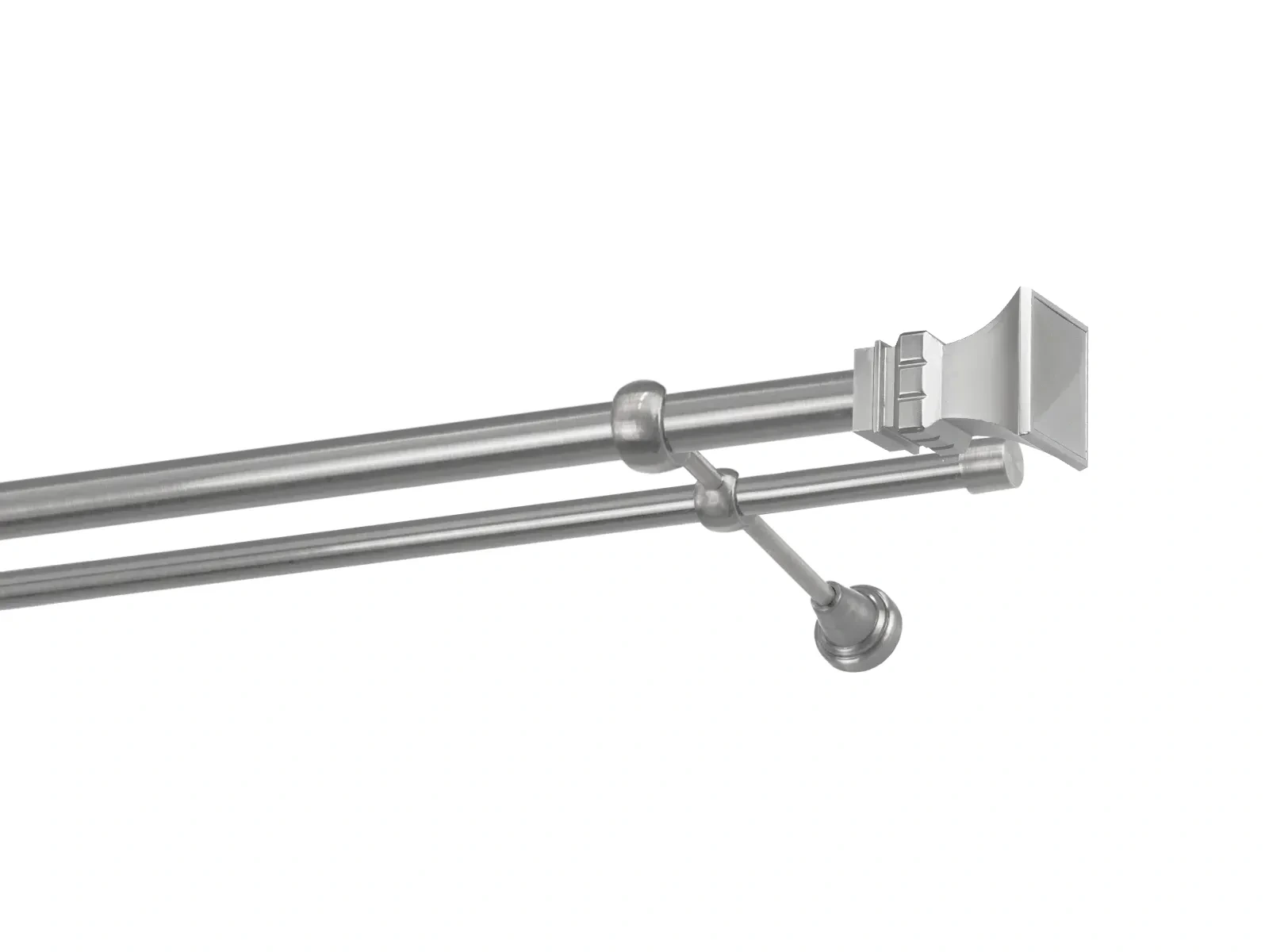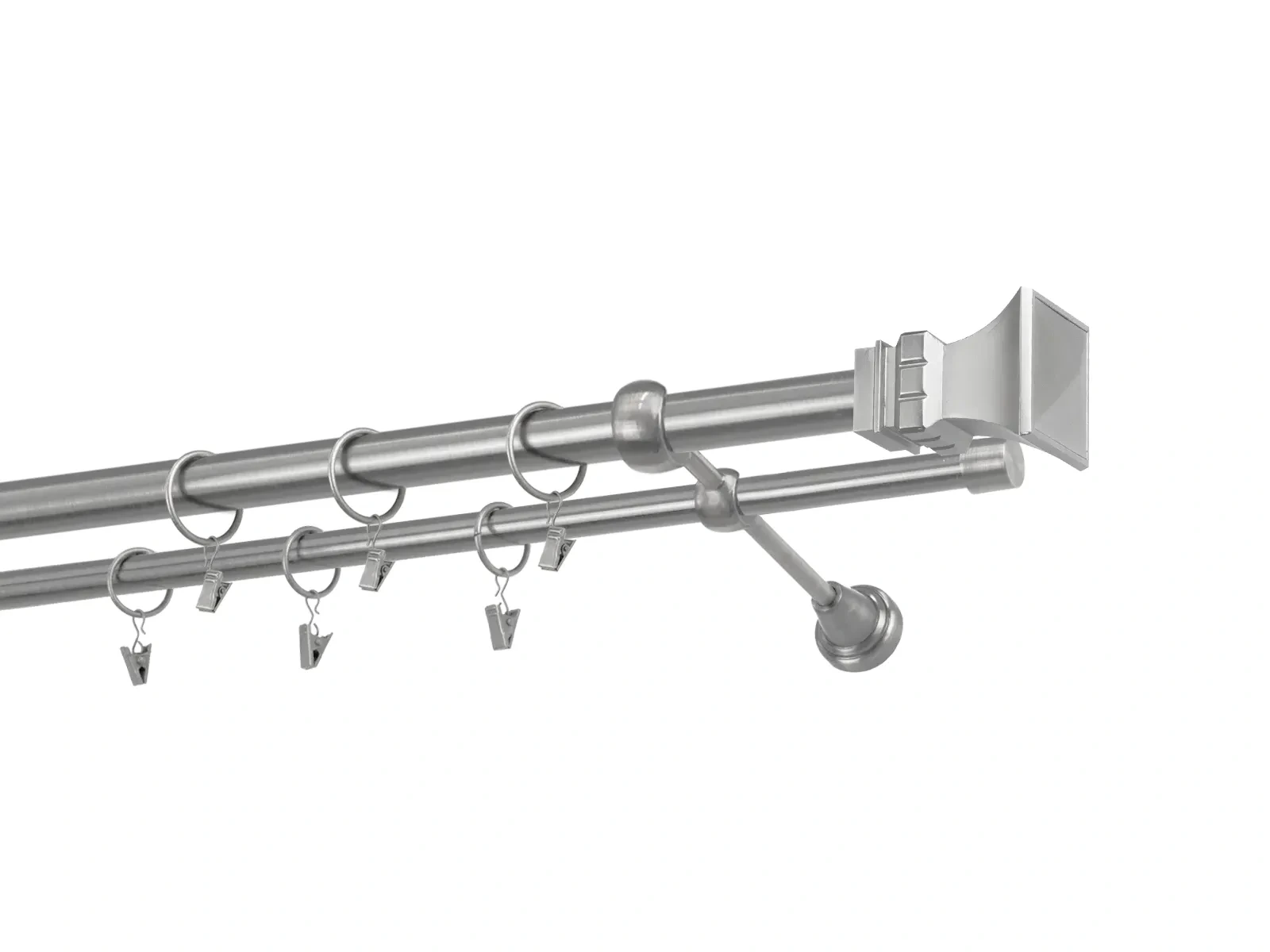 Dvouřadá garnýž s povrchovou úpravou - odstín satin (matné stříbro). Celokovová garnýž s kvalitní povrchovou úpravou - galvanické pokovování. Galvanické pokovování zabezpečuje vyšší povrchovou tvrdost, zvýšenú dolnost vůči poškrábání, hladký povrch. Dodávané jsou v kompletech.