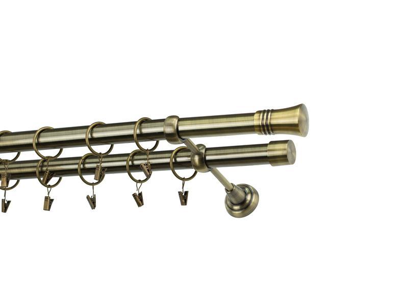 Dvouřadá garnýž s povrchovou úpravou - odstín antik (matné zlato). Celokovová garnýž s kvalitní povrchovou úpravou - galvanické pokovování. Galvanické pokovování zabezpečuje vyšší povrchovou tvrdost, zvýšenú dolnost vůči poškrábání, hladký povrch. Dodávané jsou v kompletech.
