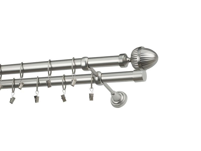 Dvouřadá garnýž s povrchovou úpravou - odstín satin (matné stříbro). Celokovová garnýž s kvalitní povrchovou úpravou - galvanické pokovování. Galvanické pokovování zabezpečuje vyšší povrchovou tvrdost, zvýšenú dolnost vůči poškrábání, hladký povrch. Dodávané jsou v kompletech.