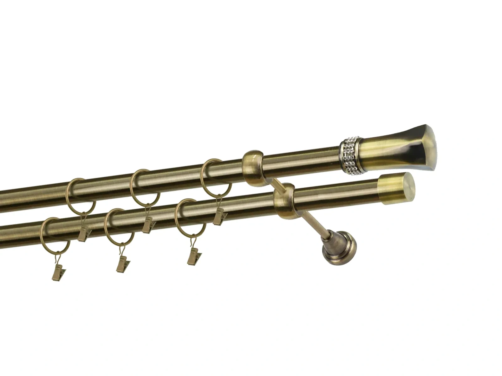 Dvouřadá garnýž s povrchovou úpravou - odstín antik (matné zlato). Celokovová garnýž s kvalitní povrchovou úpravou - galvanické pokovování. Galvanické pokovování zabezpečuje vyšší povrchovou tvrdost, zvýšenú dolnost vůči poškrábání, hladký povrch. Dodávané jsou v kompletech.