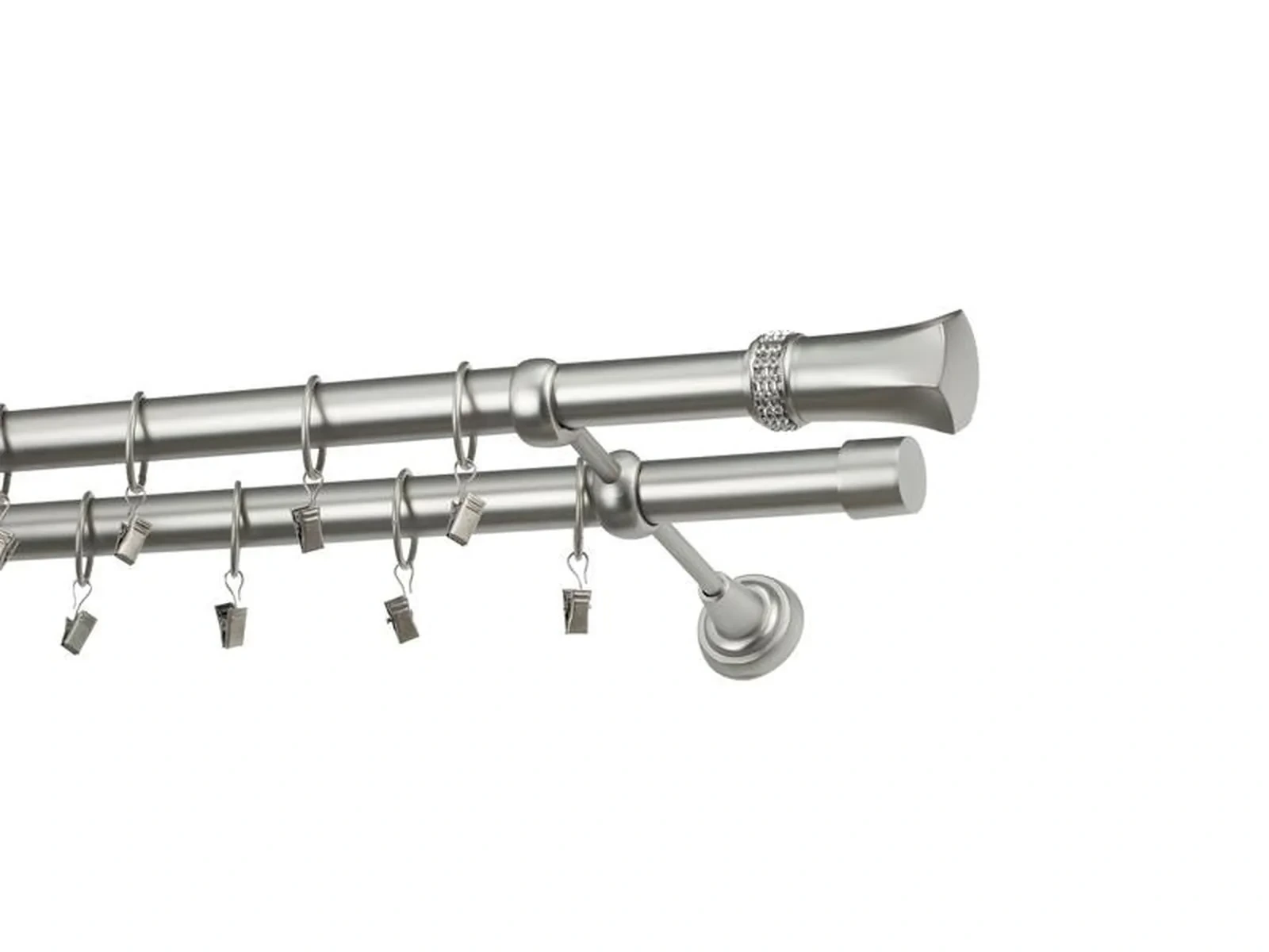 Dvouřadá garnýž s povrchovou úpravou - odstín satin (matné stříbro). Celokovová garnýž s kvalitní povrchovou úpravou - galvanické pokovování. Galvanické pokovování zabezpečuje vyšší povrchovou tvrdost, zvýšenú dolnost vůči poškrábání, hladký povrch. Dodávané jsou v kompletech.