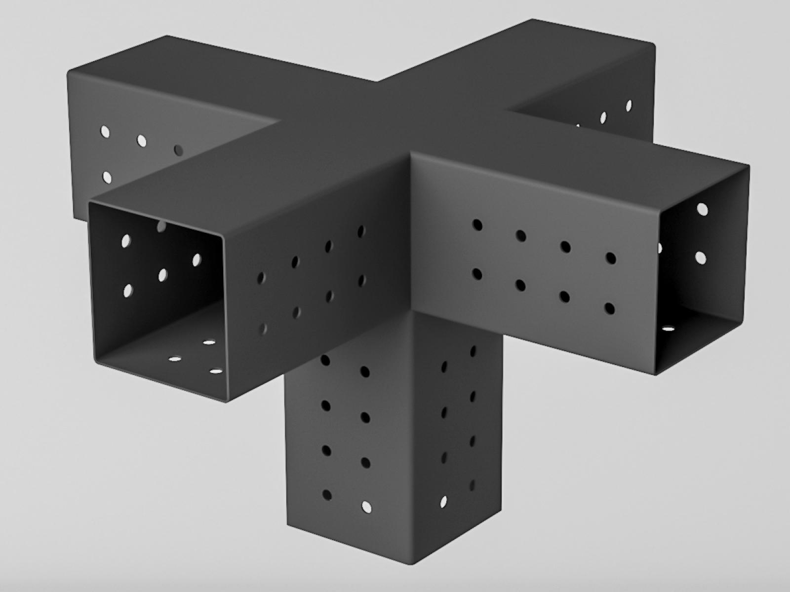 Ocelový uzlový prvek pro hranoly o průřezu 98x98mm. Slouží ke spojování hranolů pro pergoly VEGAS. Je vyroben s svařovaného pozinkovaného plechu tloušťky 2mm, s práškovou povrchovou úpravou - barva černá.