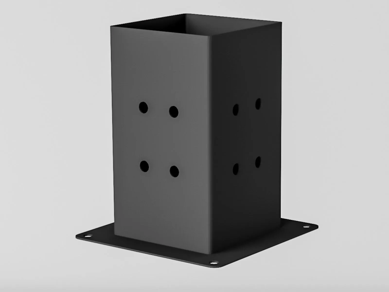 kování jsou povrchově upraveny černou práškovou barvou,. Jsou to svařované dílce z pozinkovaného plechu, tloušťka materiálu 2mm s předvrtanými otvory. Vnitřní rozměr pro hranol je 98x98mm, což poskytuje vysokou tuhost celé konstrukce.