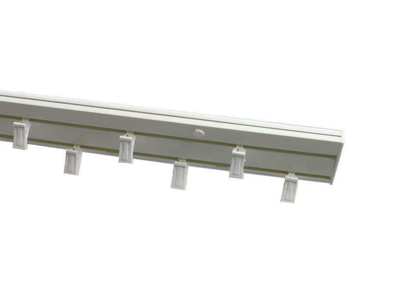 Plastová garnýž dvojdrážková, háčky nebo škripce - 1 ks na 100 mm délky, 2x koncová záslepka, záslepky otvorů, hmoždinky a vruty.
