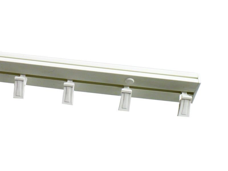 Plastová garnýž jednodrážková, háčky nebo škripce - 1 ks na 100 mm délky, 2x koncová záslepka, záslepky otvorů, hmoždinky a vruty.