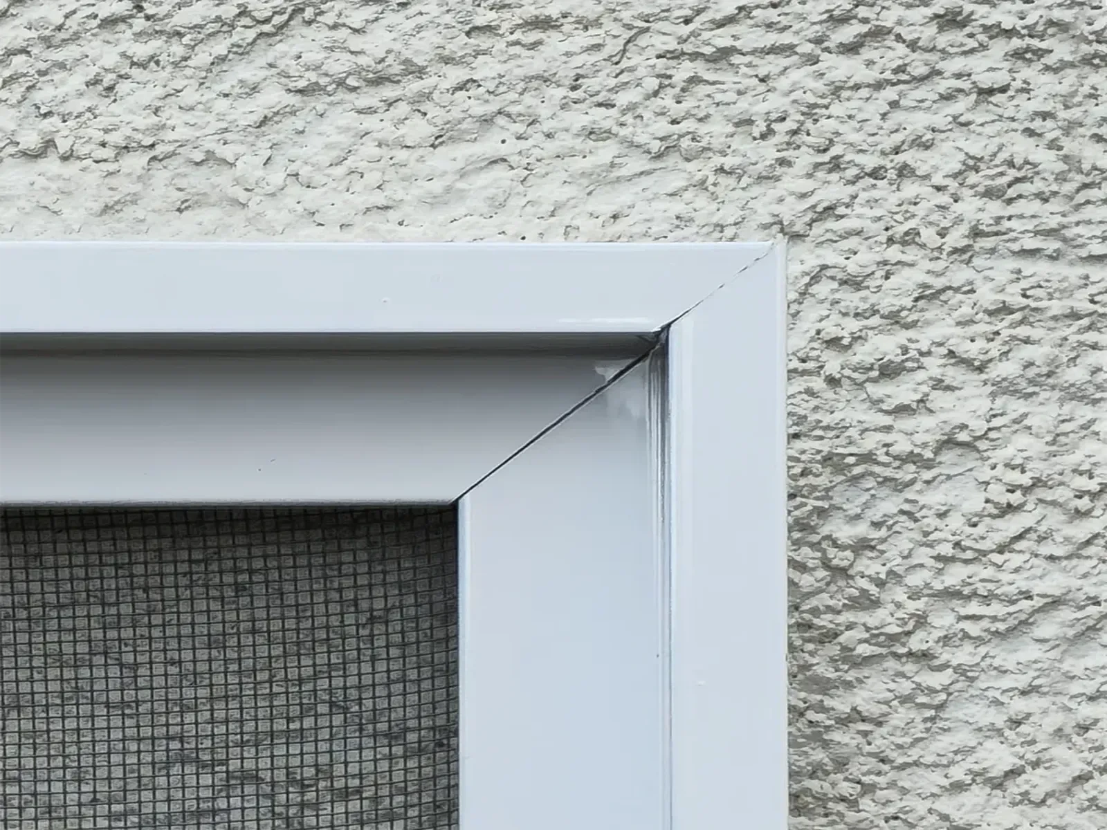 Sítě proti hmyzu na OKNO – pevné KLIK LUX se odlišují od základního modelu v tom, že rohový spojovač je vnitřní a tedy pohledově neviditelný. Profily jsou řezány pod úhlem 45°.