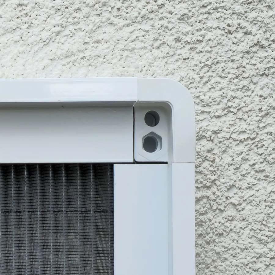 Sítě proti hmyzu na OKNO - PLISSÉ KLIK se odlišují od modelu LUX v tom, že rohový spojovač je plastový a viditelný. Profily jsou řezány pod 90° úhlem. Napínání je šňůrou v rohovém spojovači.